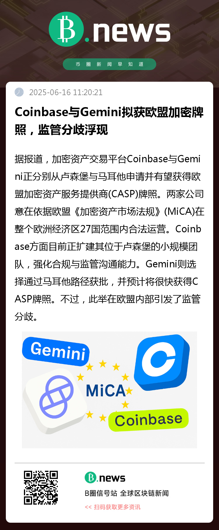 据报道,美国两家领先的加密资产交易平台Coinbase与Gemini正分别从卢森堡与马耳他申请并有望获得欧盟加密资产服务提供商(CASP)牌照。两家公司意在依据欧盟《加密资产市场法规》(MiCA)在整个欧洲经济区27国范围内合法运营。
