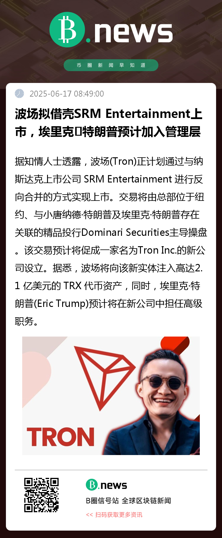 据知情人士透露,全球知名区块链平台波场(Tron)正计划通过与纳斯达克上市公司 SRM Entertainment 进行反向合并的方式实现上市。交易将由总部位于纽约、与小唐纳德·特朗普及埃里克·特朗普存在关联的精品投行Dominari Securities主导操盘。