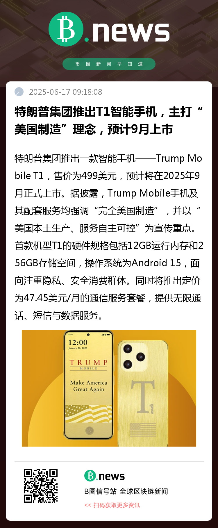 除了硬件,特朗普集团还将推出名为“Trump Wireless”的通信服务套餐,定价为47.45美元/月,提供无限通话、短信与数据服务。该定价被认为具有象征意义,暗含特朗普担任第45任与第47任总统的政治履历。