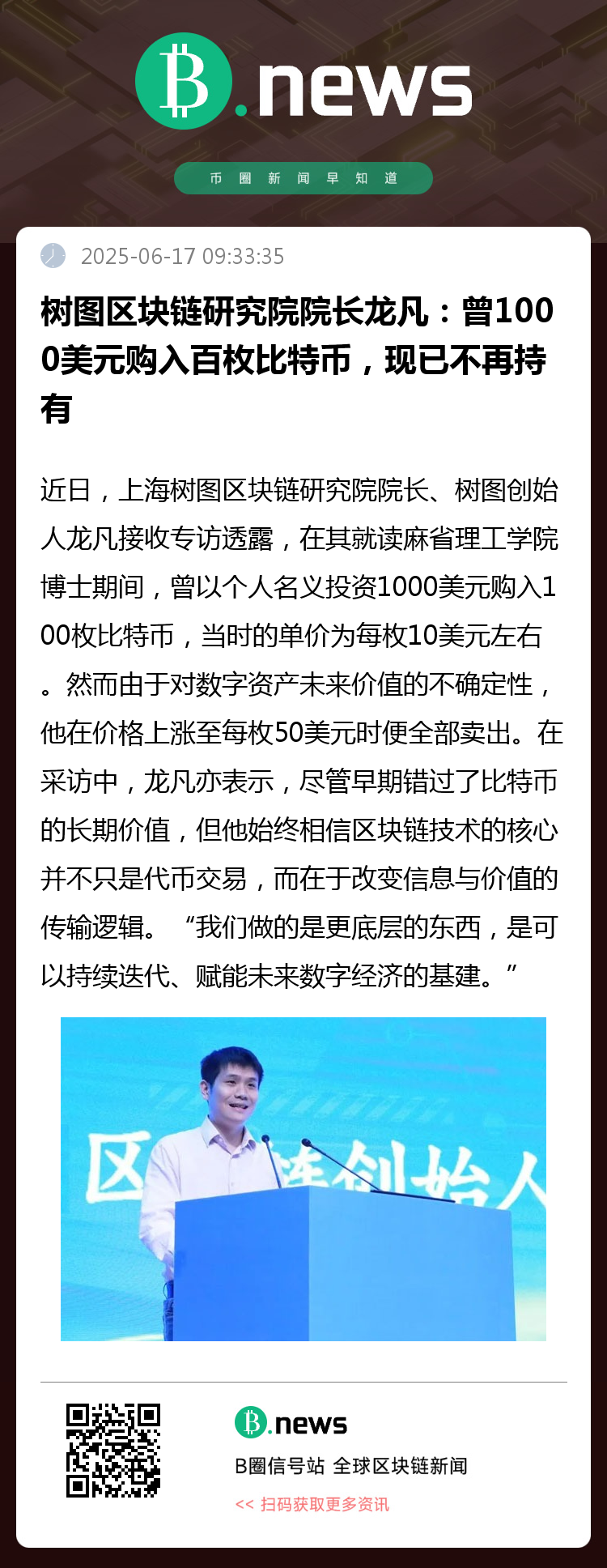 在采访中,龙凡亦表示,尽管早期错过了比特币的长期价值,但他始终相信区块链技术的核心并不只是代币交易,而在于改变信息与价值的传输逻辑。“我们做的是更底层的东西,是可以持续迭代、赋能未来数字经济的基建。”