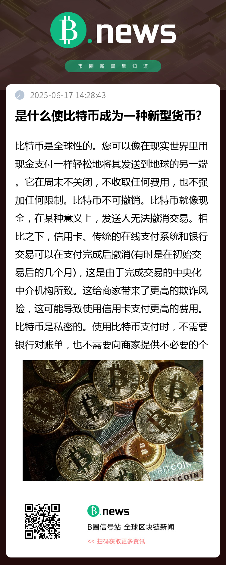 比特币是全球性的。您可以像在现实世界里用现金支付一样轻松地将其发送到地球的另一端。它在周末不关闭,不收取任何费用,也不强加任何限制。