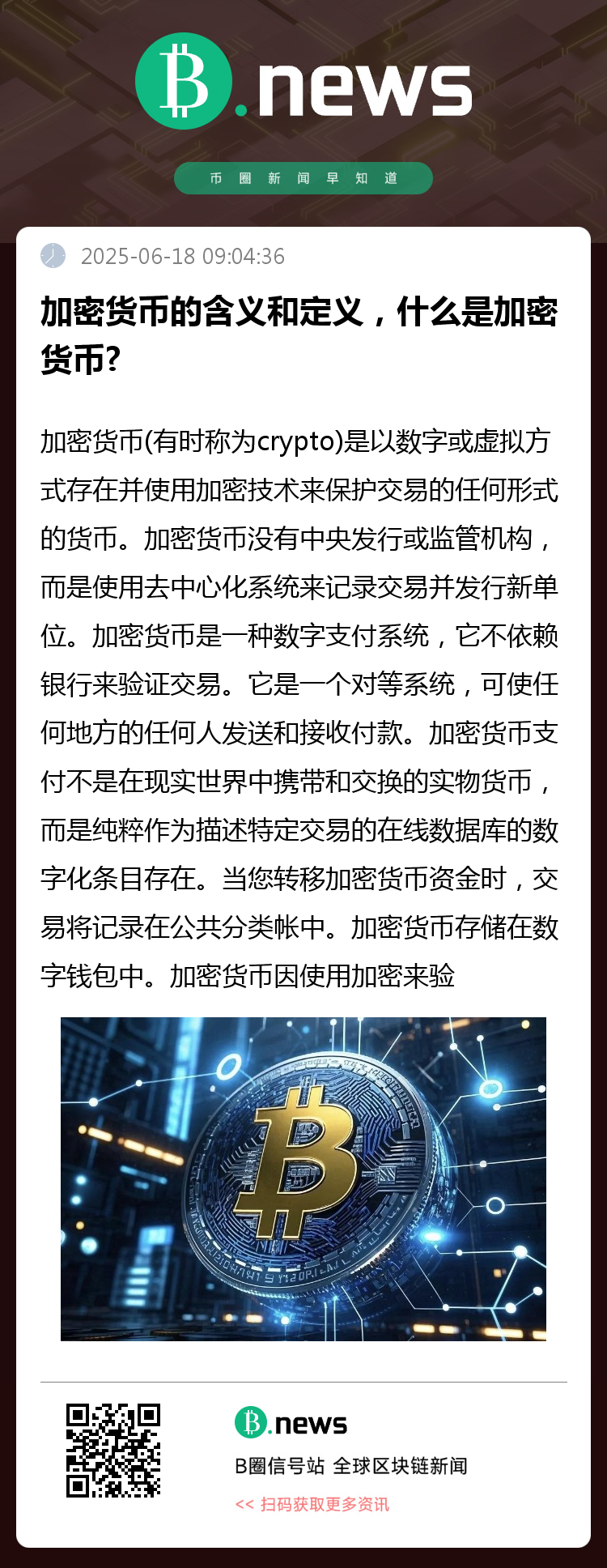 加密货币(有时称为crypto)是以数字或虚拟方式存在并使用加密技术来保护交易的任何形式的货币。加密货币没有中央发行或监管机构,而是使用去中心化系统来记录交易并发行新单位。