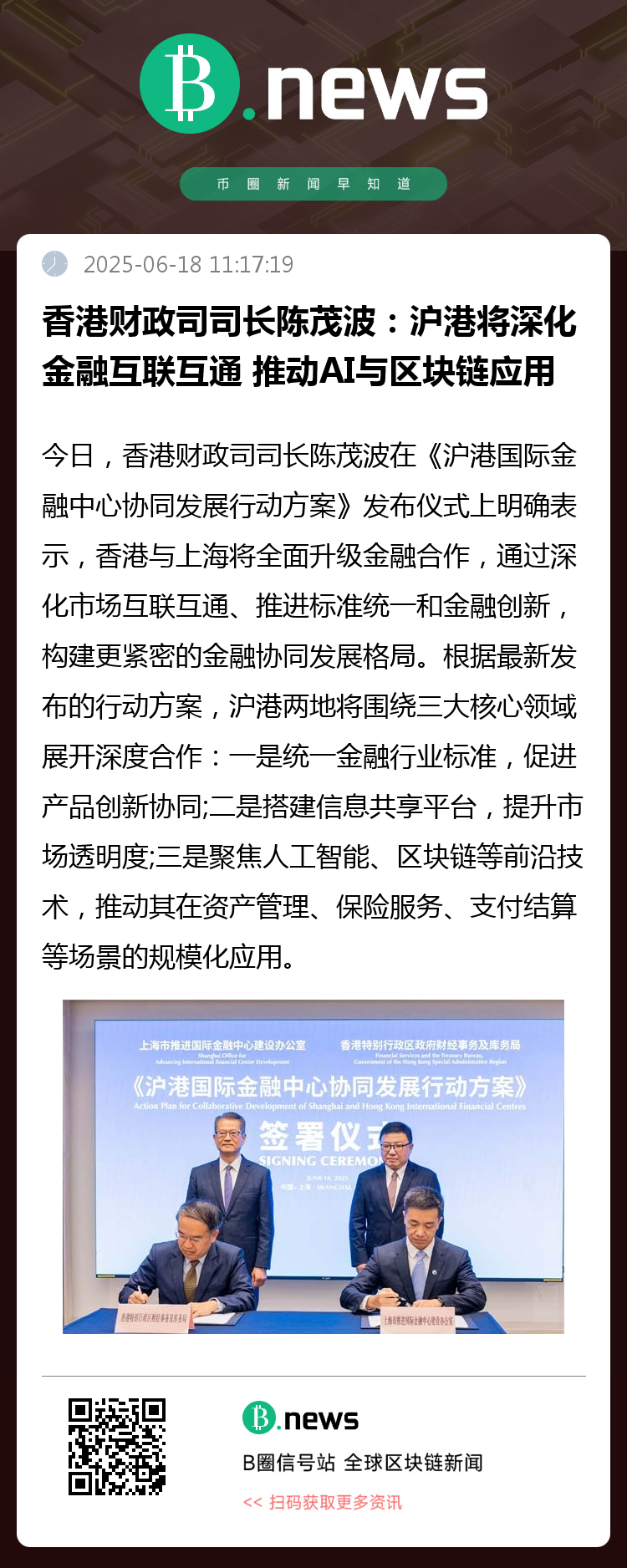 今日,香港财政司司长陈茂波在《沪港国际金融中心协同发展行动方案》发布仪式上明确表示,香港与上海将全面升级金融合作,通过深化市场互联互通、推进标准统一和金融创新,构建更紧密的金融协同发展格局。