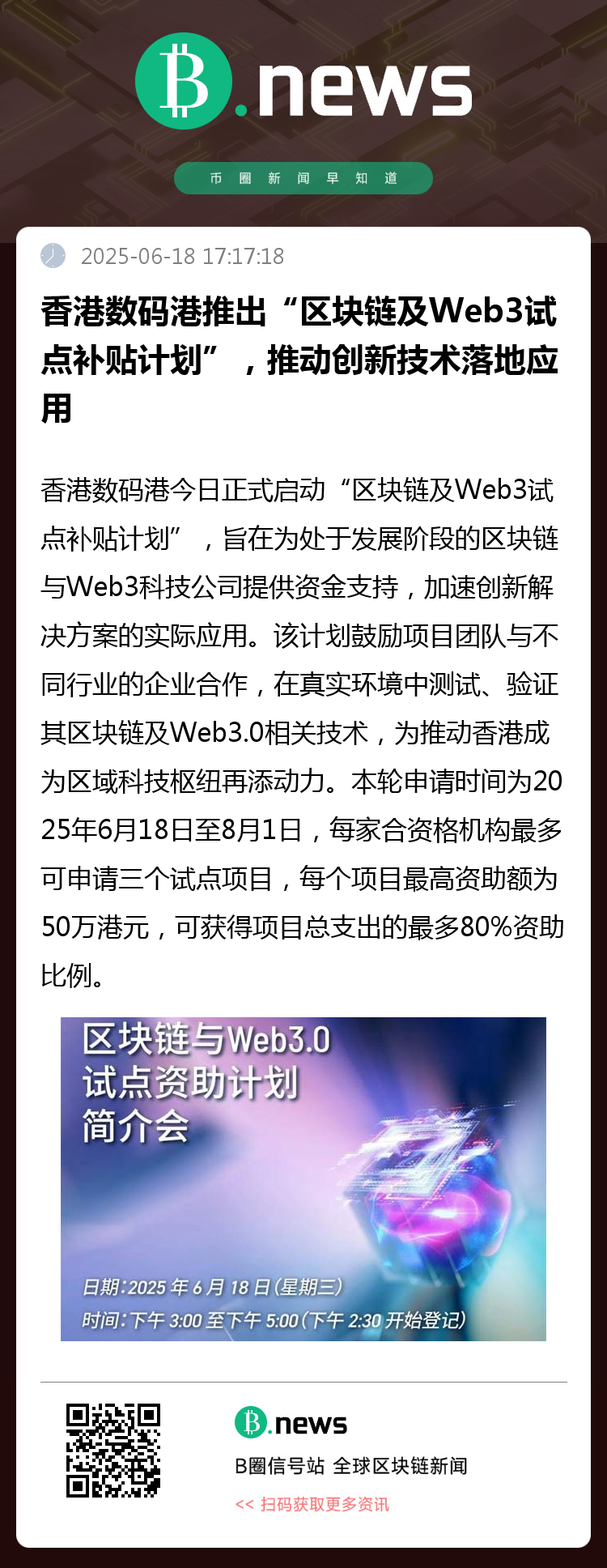香港数码港今日正式启动“区块链及 Web3 试点补贴计划”,旨在为处于发展阶段的区块链与Web3科技公司提供资金支持,加速创新解决方案的实际应用。该计划鼓励项目团队与不同行业的企业合作,在真实环境中测试、验证其区块链及Web3.0相关技术,为推动香港成为区域科技枢纽再添动力。