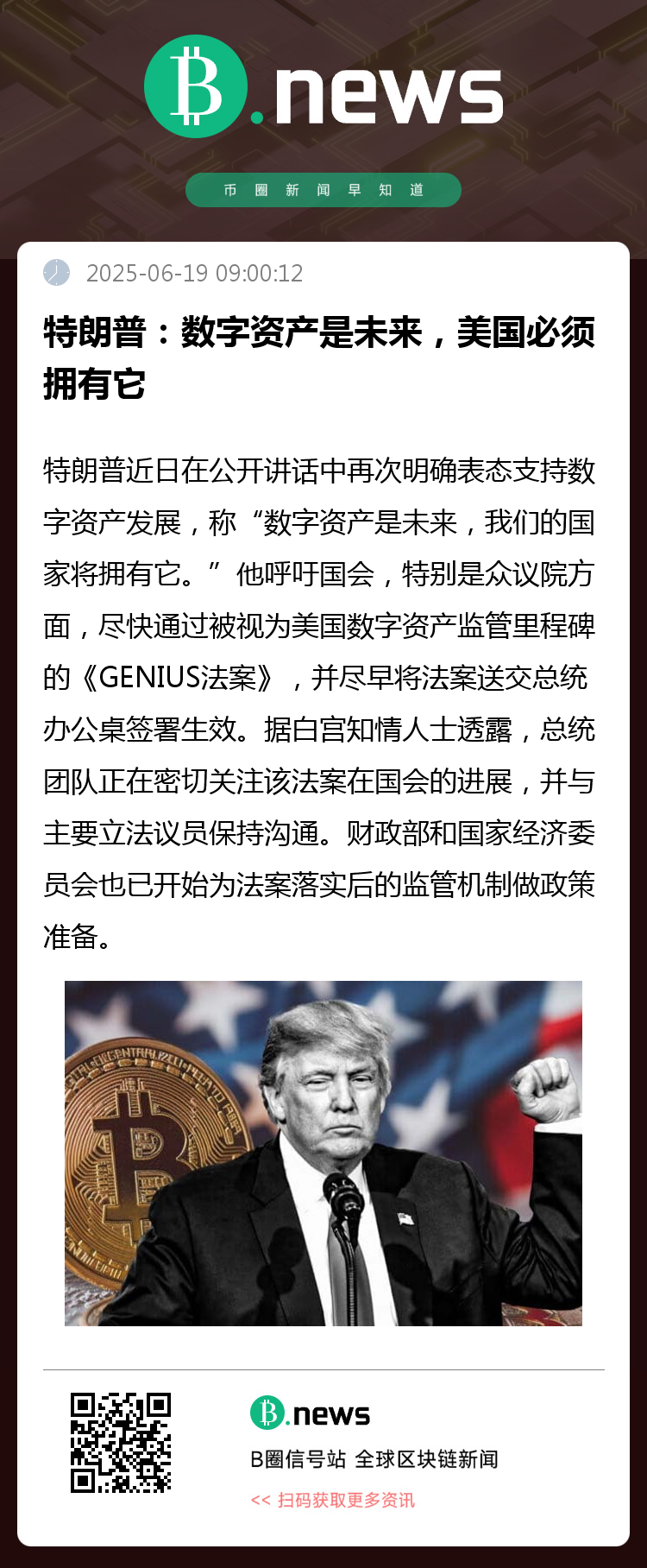 特朗普近日在公开讲话中再次明确表态支持数字资产发展,称“数字资产是未来,我们的国家将拥有它。”他呼吁国会,特别是众议院方面,尽快通过被视为美国数字资产监管里程碑的《GENIUS法案》,并尽早将法案送交总统办公桌签署生效。