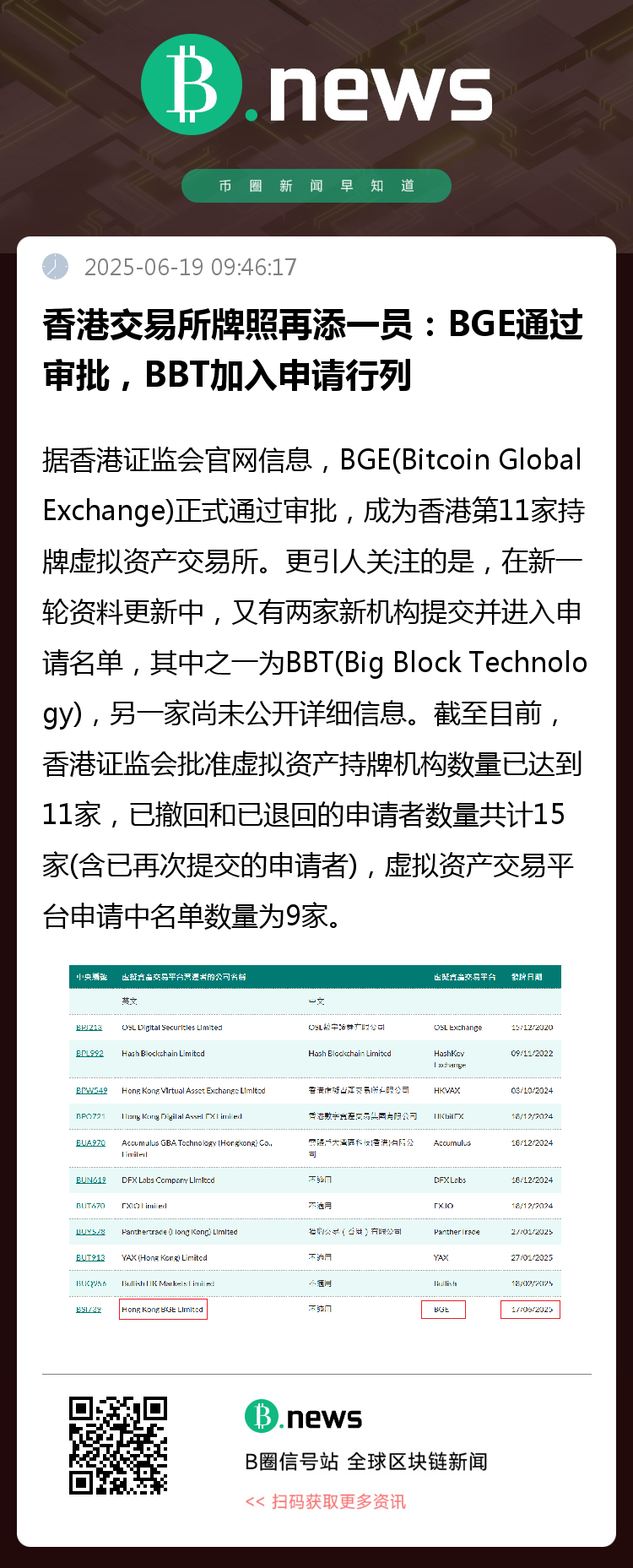 据香港证券及期货事务监察委员会(证监会)官网最新更新,虚拟资产交易平台(VATP)牌照再添新成员。BGE(Bitcoin Global Exchange)正式通过审批,成为香港第11家持牌虚拟资产交易所。这标志着香港在推动合规数字资产交易环境上的步伐持续加快,平台数量稳步上升。