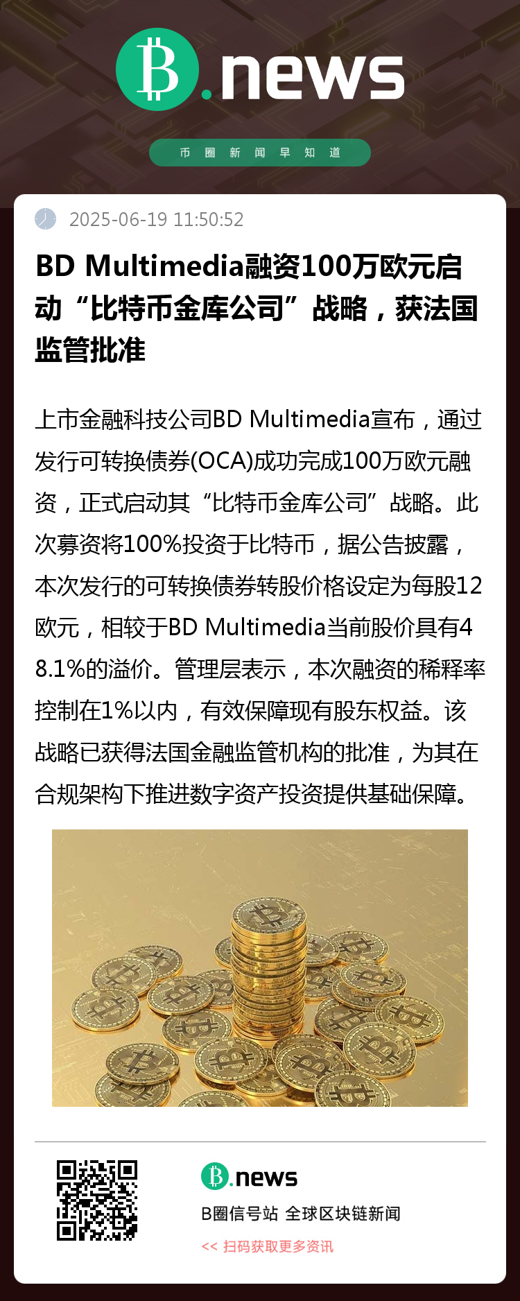 总部位于法国巴黎的上市金融科技公司 BD Multimedia(泛欧交易所代码:ALBDM)宣布,通过发行可转换债券(OCA)成功完成100万欧元融资,正式启动其“比特币金库公司”(Bitcoin Treasury Company)战略。此次募资将100%投资于比特币,旨在将比特币作为公司核心战略资产进行长期储备。