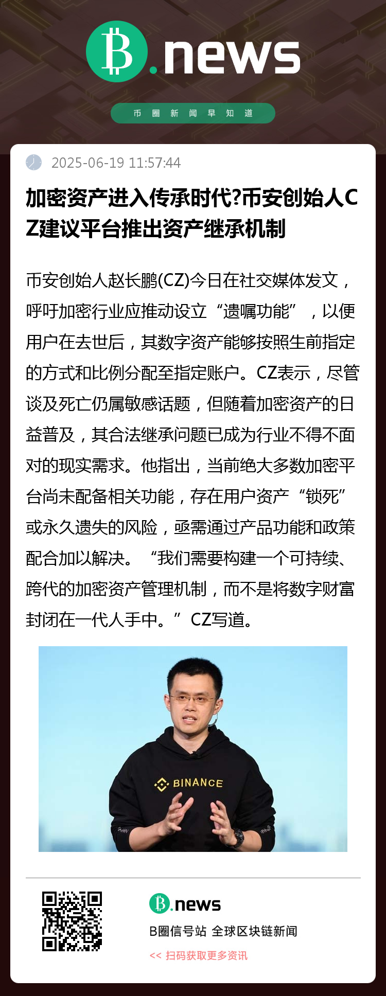 业内人士普遍认为,CZ的呼吁反映了加密行业走向成熟的必要进程。随着更多家庭和高净值用户将数字资产纳入财富配置,确保其跨代传承正成为平台和监管者必须正视的问题。加密资产“遗嘱功能”的推进,或将成为Web3基础设施完善的重要一环。