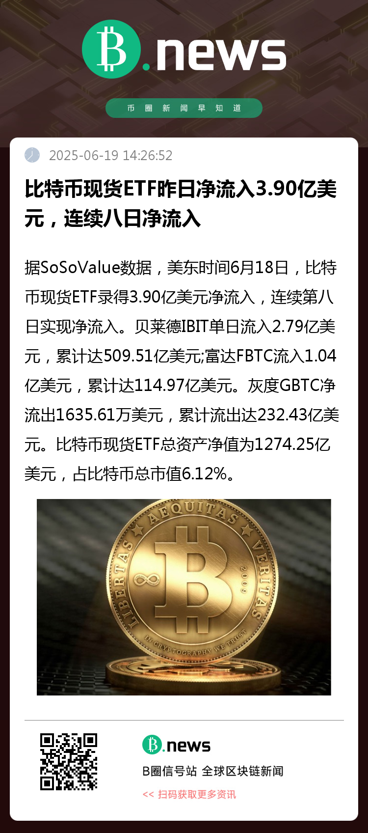 据SoSoValue数据,美东时间6月18日,比特币现货ETF录得3.90亿美元净流入,连续第八日实现净流入。
