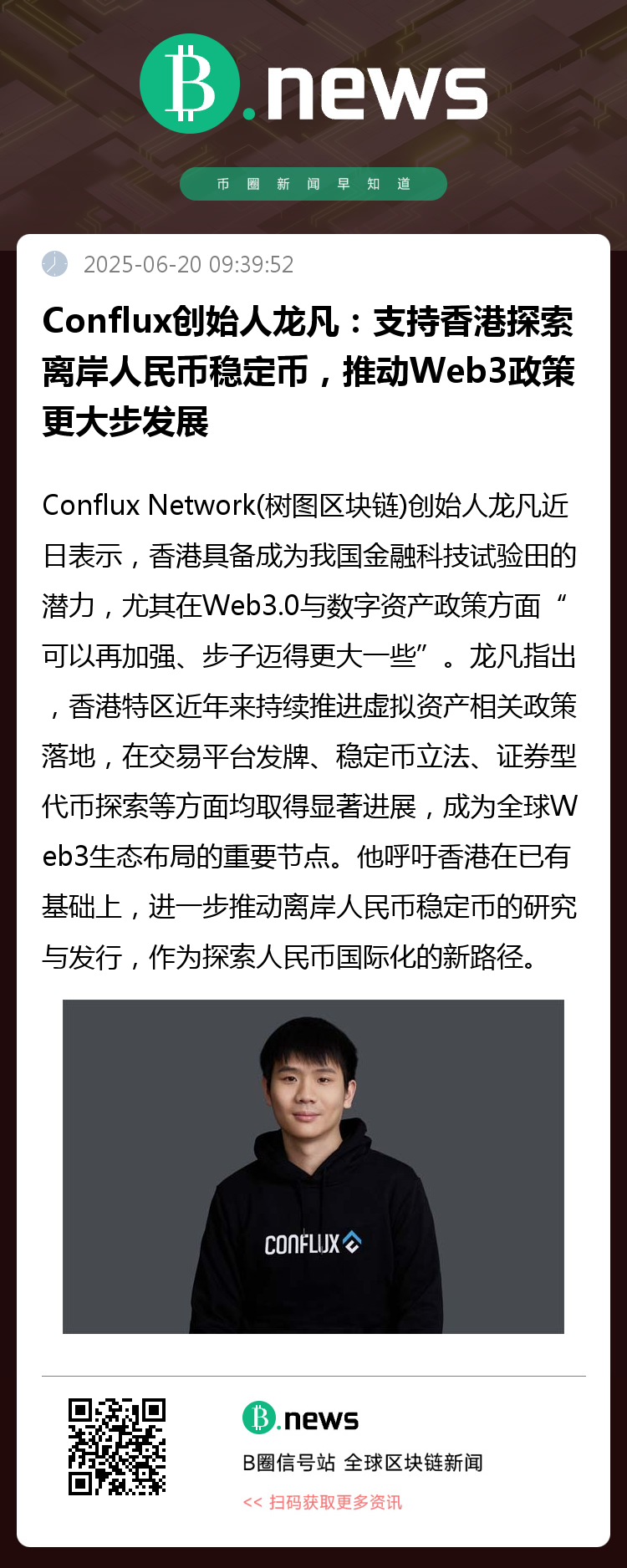 Conflux Network(树图区块链)创始人、上海树图区块链研究院院长龙凡近日表示,香港作为一个金融开放且高度自由的城市,具备成为国家金融科技试验田的潜力,尤其在Web3.0与数字资产政策方面“可以再加强、步子迈得更大一些”。