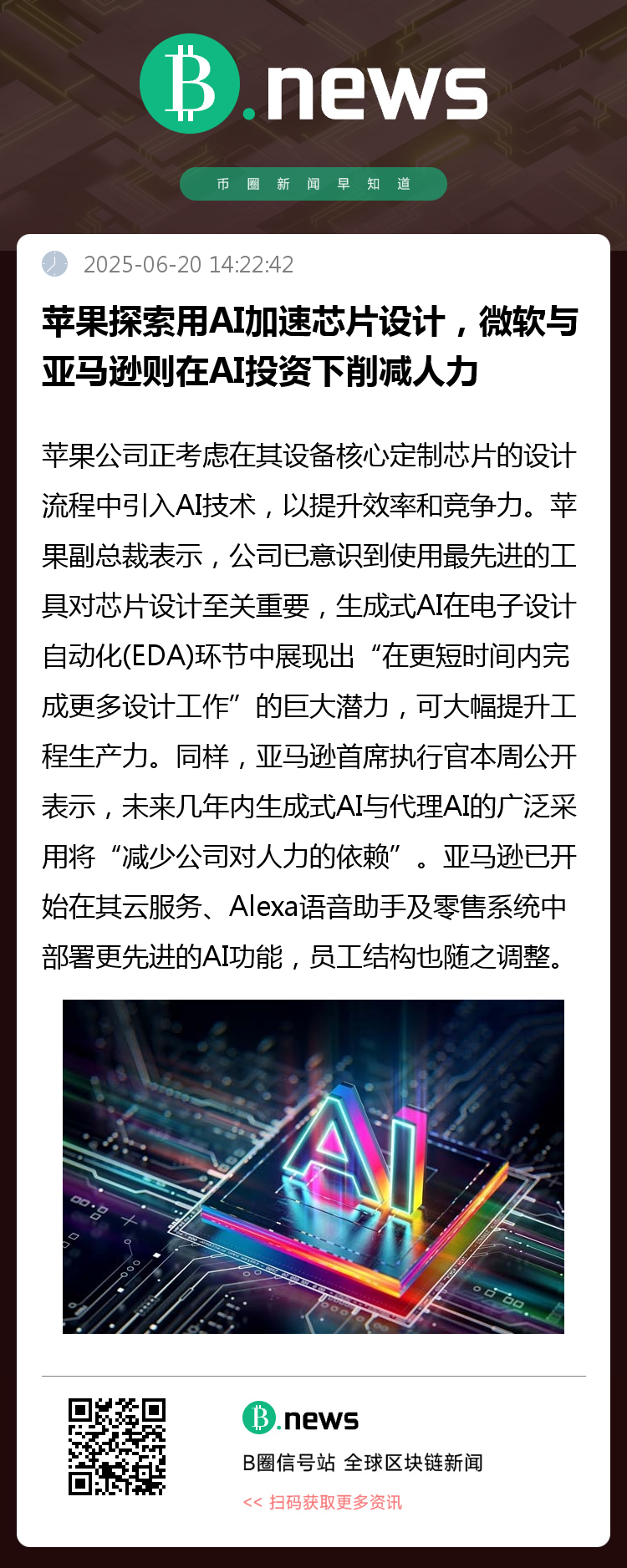 随着生成式人工智能(AI)在各行业应用加速,全球科技巨头正加快调整战略。苹果公司正考虑在其设备核心定制芯片的设计流程中引入AI技术,以提升效率和竞争力;与此同时,微软与亚马逊则在加大AI投资的背景下选择缩减人力结构。