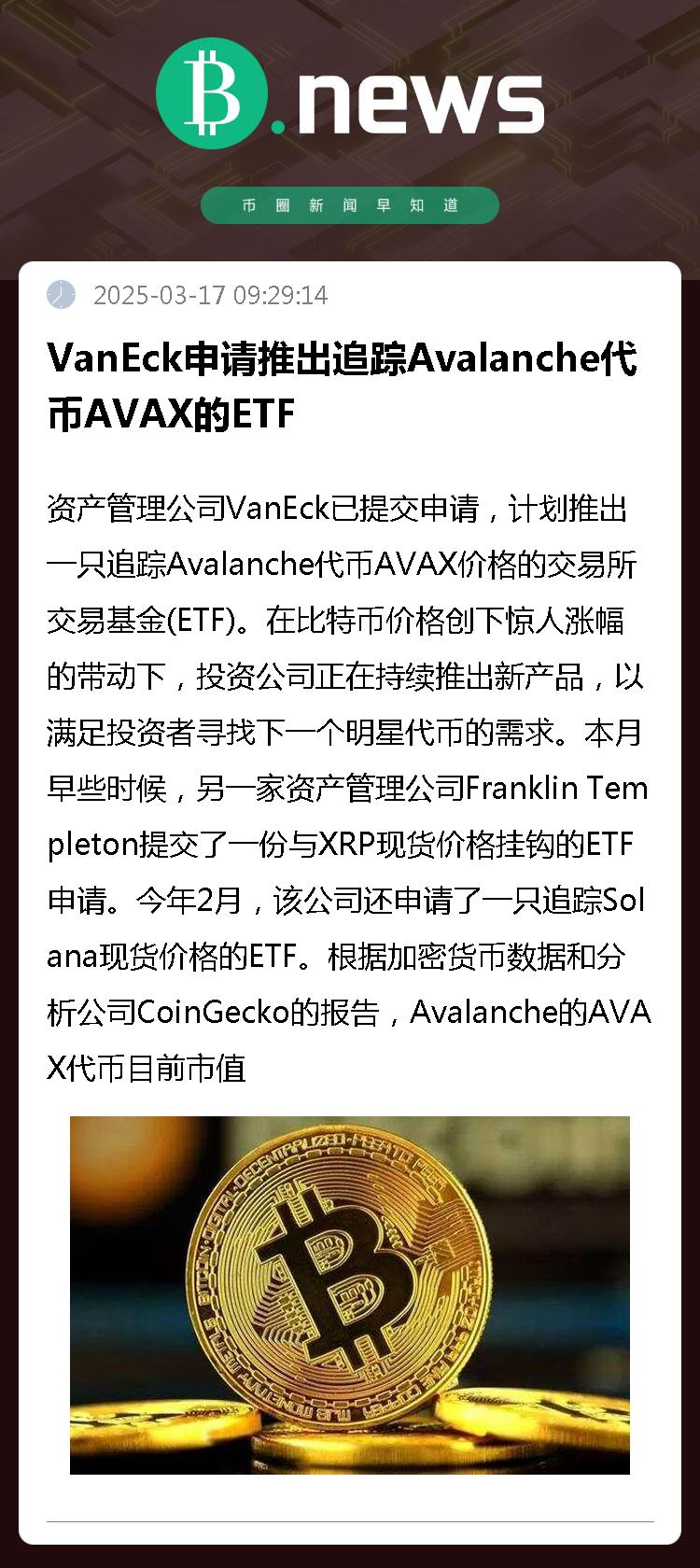 资产管理公司VanEck已提交申请,计划推出一只追踪Avalanche代币AVAX价格的交易所交易基金(ETF)。