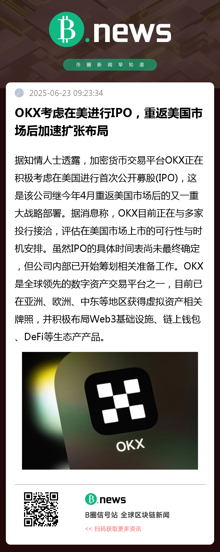 据知情人士透露,加密货币交易平台OKX正在积极考虑在美国进行首次公开募股(IPO),这是该公司继今年4月重返美国市场后的又一重大战略部署。