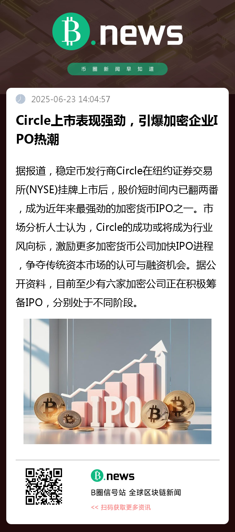 据报道,稳定币发行商Circle在纽约证券交易所(NYSE)挂牌上市后,股价短时间内已翻两番,成为近年来最强劲的加密货币IPO之一。市场分析人士认为,Circle的成功或将成为行业风向标,激励更多加密货币公司加快IPO进程,争夺传统资本市场的认可与融资机会。