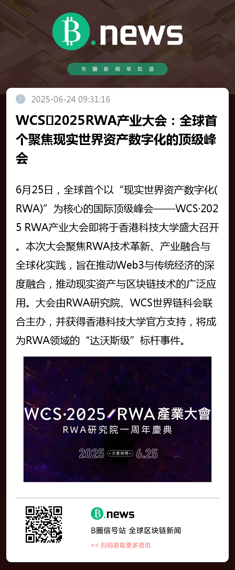 WCS·2025 RWA产业大会将为参与者提供一个展示创新、推进技术落地、构建未来产业生态的重要平台,欢迎各界人士积极参与!B.news期待在大会现场与各位一起见证更多精彩。
