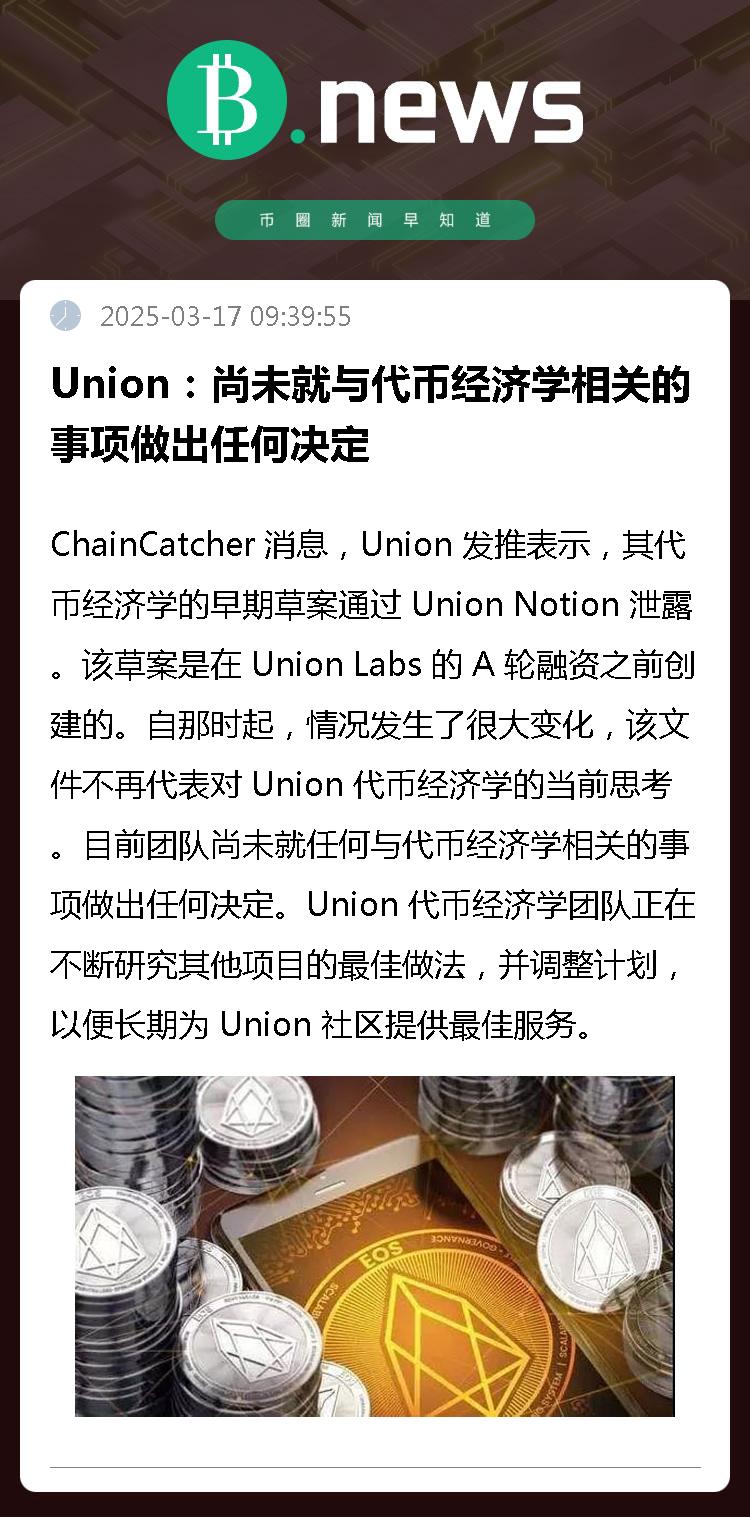 ChainCatcher 消息,Union 发推表示,其代币经济学的早期草案通过 Union Notion 泄露。该草案是在 Union Labs 的 A 轮融资之前创建的。自那时起,情况发生了很大变化,该文件不再代表对 Union 代币经济学的当前思考。目前团队尚未就任何与代币经济学相关的事项做出任何决定。Union 代币经济学团队正在不断研究其他项目的最佳做法,并调整计划,以便长期为 Union 社区提供最佳服务。