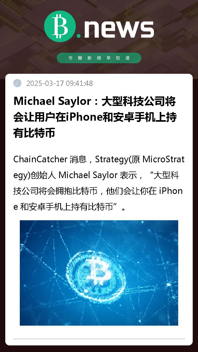 ChainCatcher 消息,Strategy(原 MicroStrategy)创始人 Michael Saylor 表示,“大型科技公司将会拥抱比特币,他们会让你在 iPhone 和安卓手机上持有比特币”。