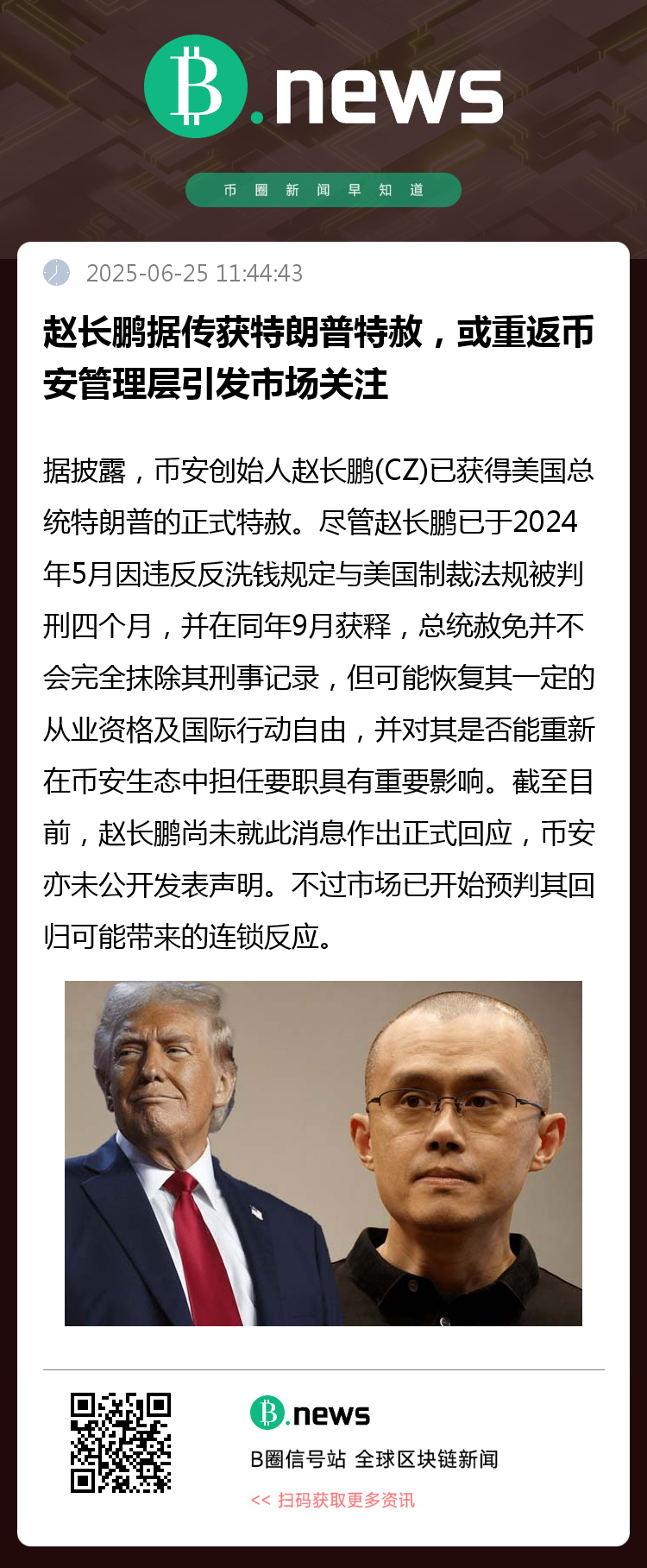 据多方信源披露,币安创始人赵长鹏(CZ)已获得美国总统特朗普的正式特赦。尽管赵长鹏已于2024年完成联邦监禁并缴纳巨额罚款(包括5,000万美元刑事罚款及另一笔5,000万美元支付给美国商品期货交易委员会(CFTC)),此次特赦的意义仍非同小可,或将为其重返币安高层管理岗位打开法律通道。