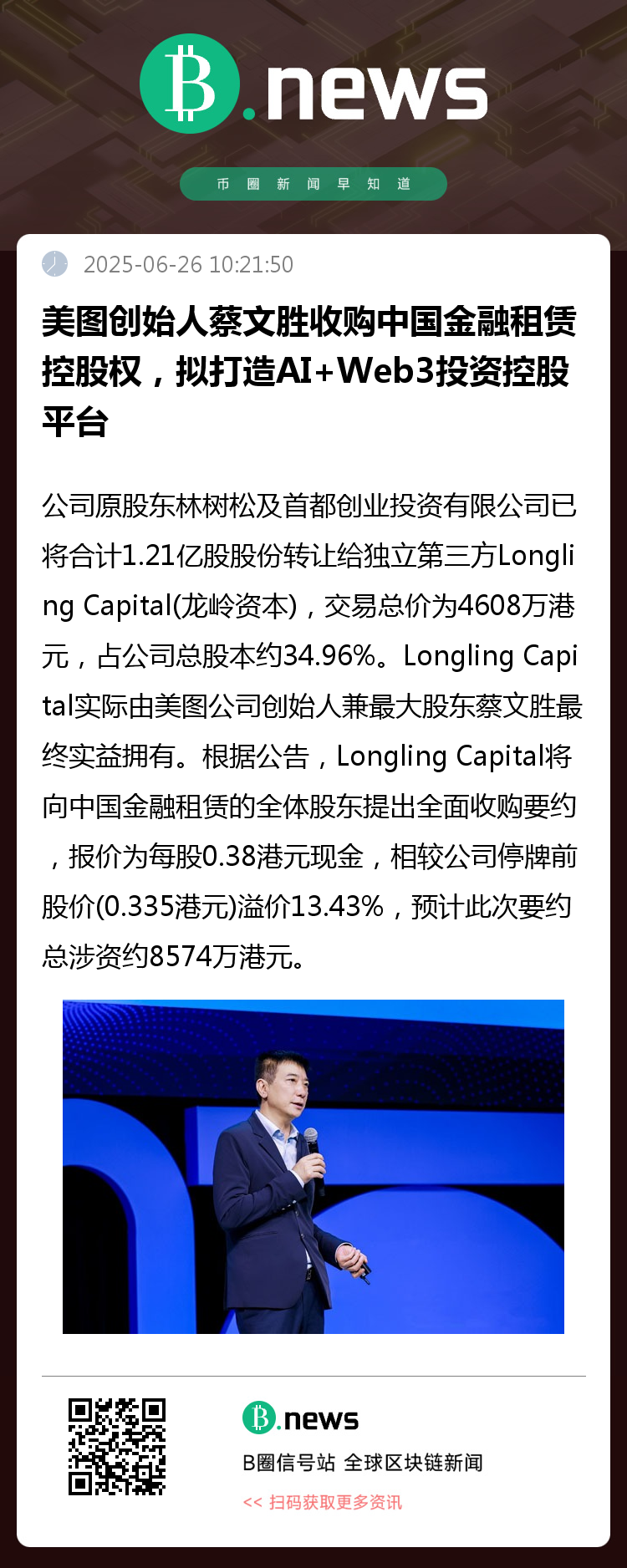 蔡文胜以美图起家,近年来活跃于区块链和Web3生态,曾多次投资NFT、数字钱包及AI生成式平台等领域。本次通过Longling Capital收购传统金融租赁企业,并计划转型为科技与数字资产投资平台,显示其进一步聚焦“科技+资本”交叉领域的战略意图。