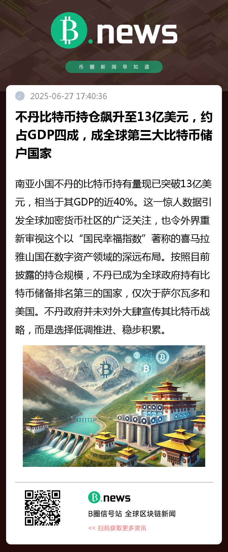 南亚小国不丹的比特币持有量现已突破13亿美元,相当于其国内生产总值(GDP)的近40%。这一惊人数据引发全球加密货币社区的广泛关注,也令外界重新审视这个以“国民幸福指数”著称的喜马拉雅山国在数字资产领域的深远布局。