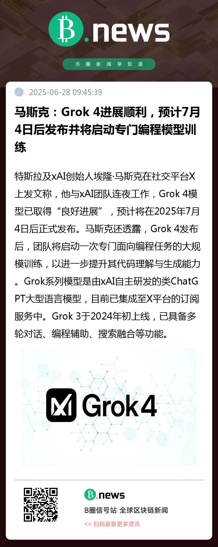 特斯拉及xAI创始人埃隆·马斯克在社交平台X上发文称,他与xAI团队连夜工作,Grok 4模型已取得“良好进展”,预计将在2025年7月4日后正式发布。