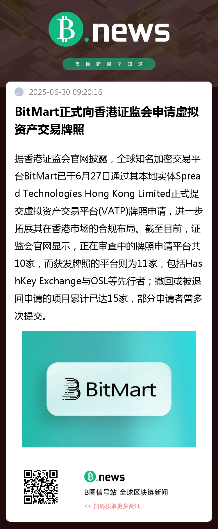 根据香港证券及期货事务监察委员会(证监会)官网最新披露,全球知名加密交易平台BitMart已于2025年6月27日通过其本地实体Spread Technologies Hong Kong Limited正式提交虚拟资产交易平台(VATP)牌照申请,进一步拓展其在香港市场的合规布局。