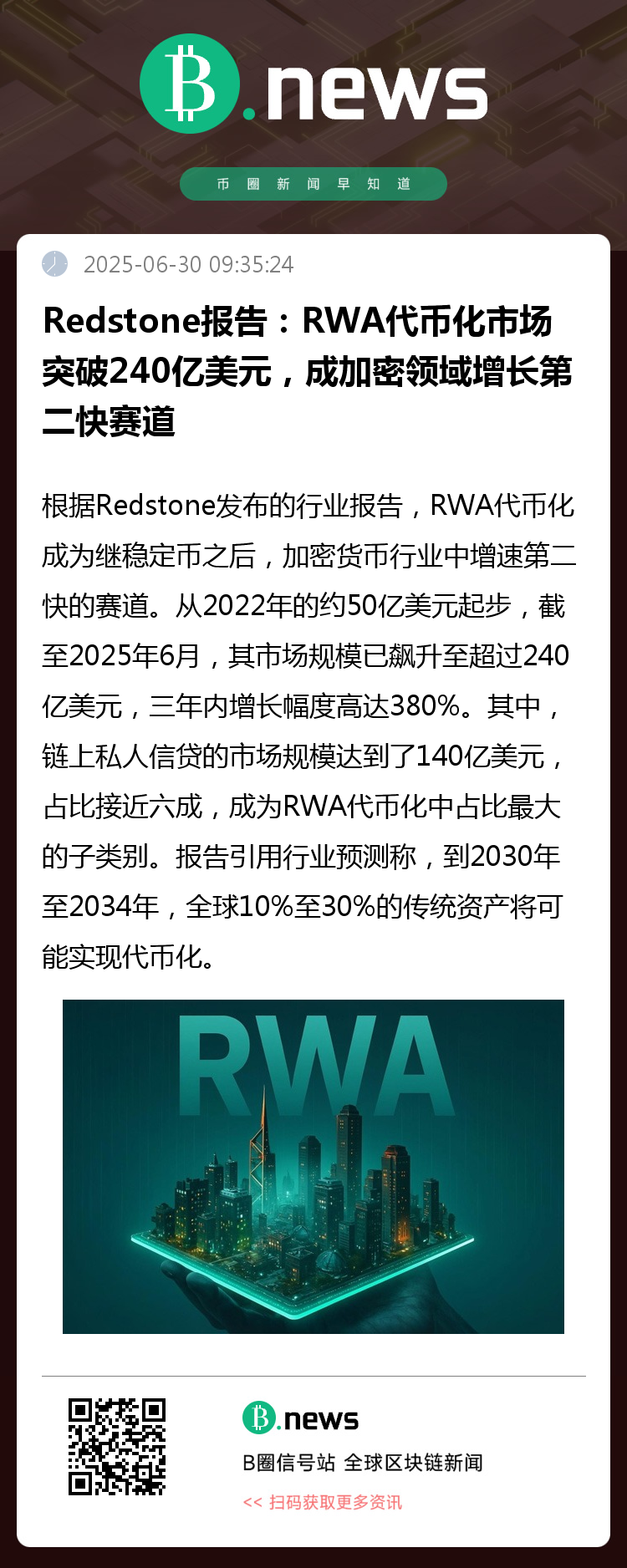 展望未来,Redstone 报告引用行业预测称,到2030年至2034年,全球10%至30%的传统资产将可能实现代币化。若按当前趋势推算,RWA将成为连接传统金融与区块链技术的核心桥梁。