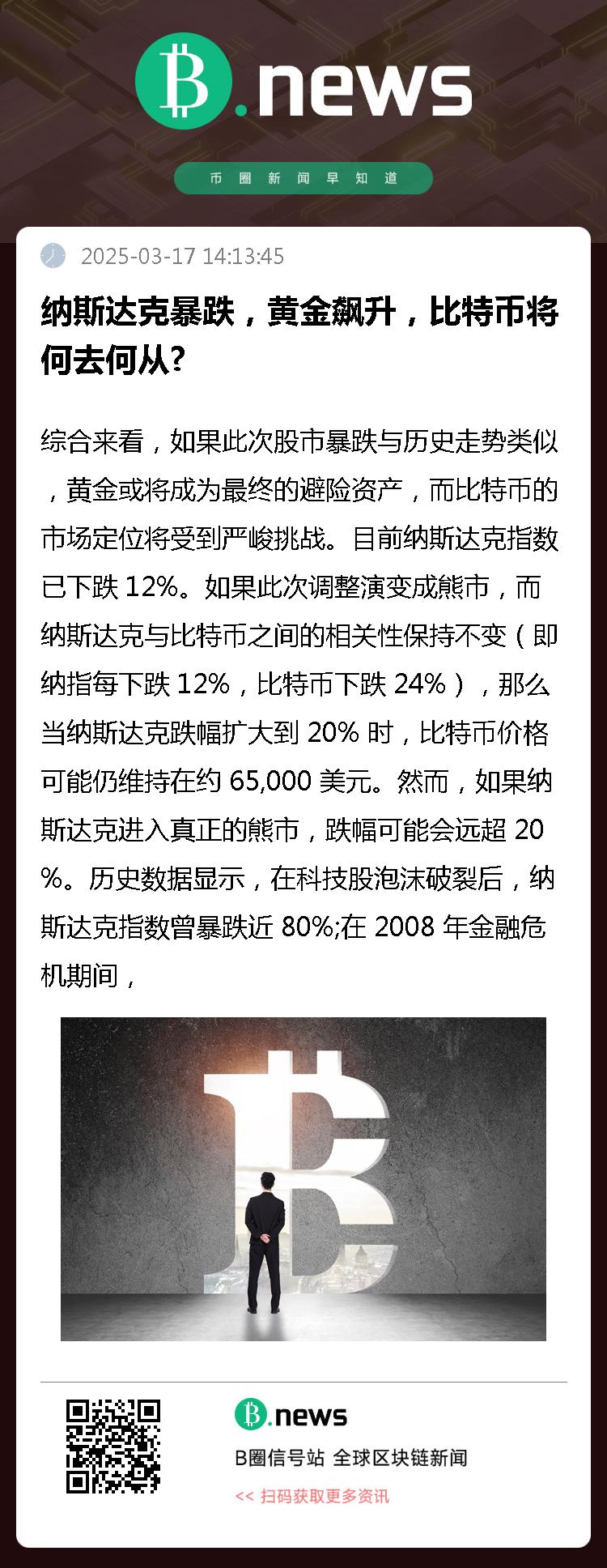 综合来看,如果此次股市暴跌与历史走势类似,黄金或将成为最终的避险资产,而比特币的市场定位将受到严峻挑战。比特币能否在这种大环境下成功脱离科技股的风险资产属性,真正建立“数字黄金”的价值定位,将成为未来市场关注的关键。