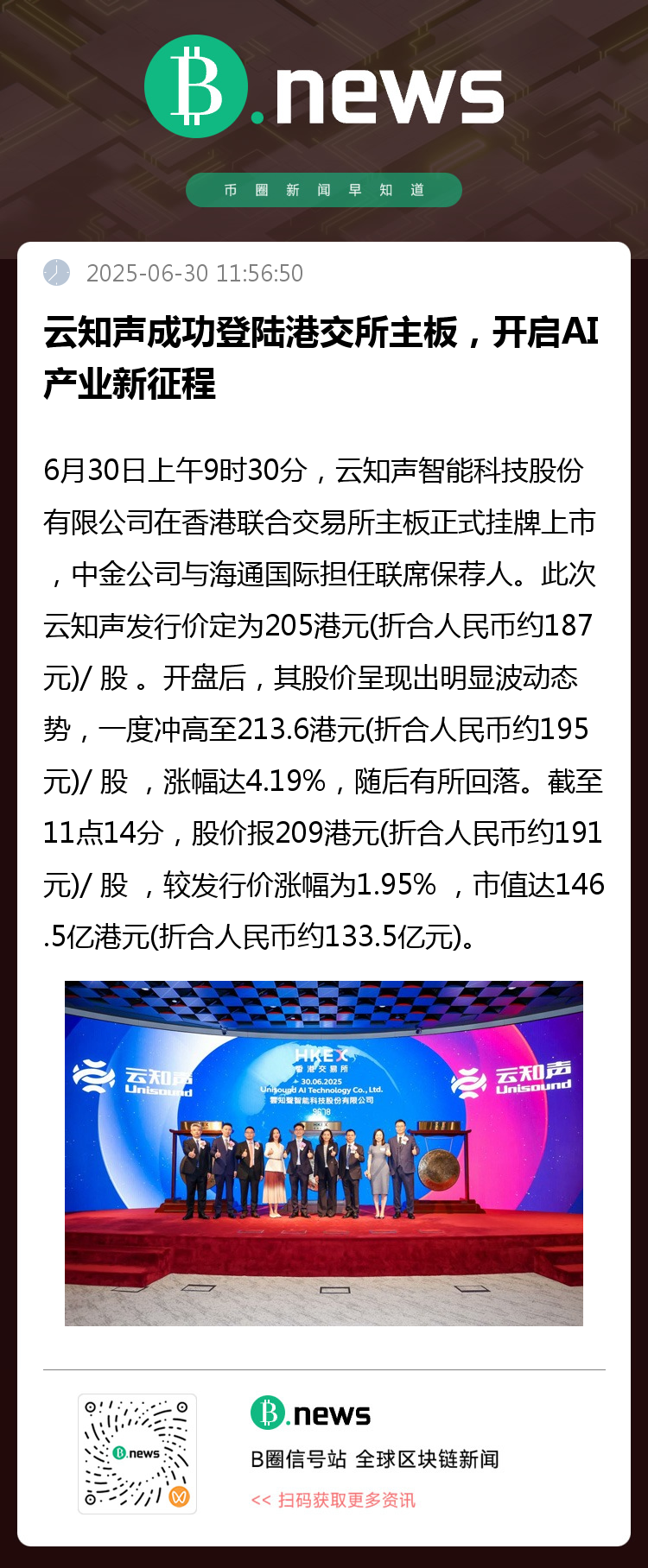 2025 年 6 月 30 日上午 9 时 30 分,云知声智能科技股份有限公司(股份代号:09678.HK)在香港联合交易所主板正式挂牌上市 ,中金公司与海通国际担任联席保荐人。
