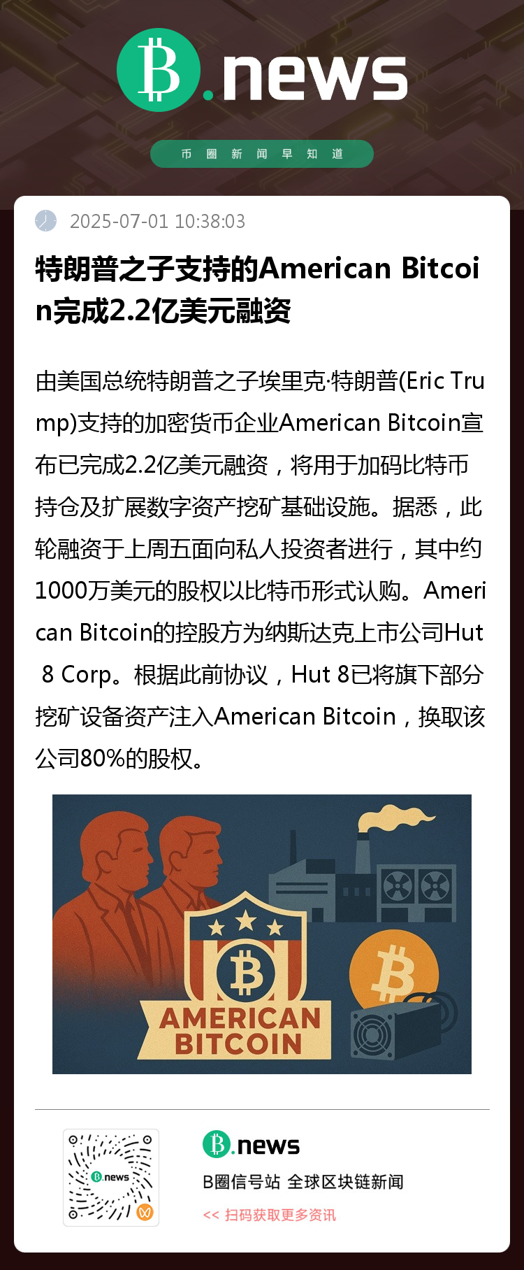 由美国总统特朗普之子埃里克·特朗普(Eric Trump)支持的加密货币企业American Bitcoin宣布已完成2.2 亿美元融资,将用于加码比特币持仓及扩展数字资产挖矿基础设施。