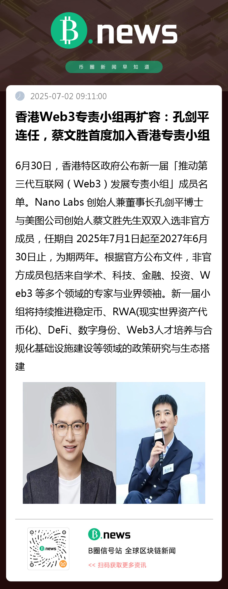 近日,香港特别行政区政府正式公布新一届「推动第三代互联网(Web3)发展专责小组」成员名单。Nano Labs(纳斯达克股票代码:NA)创始人兼董事长孔剑平博士与美图公司创始人蔡文胜双双入选非官方成员,任期自2025年7月1日起至2027年6月30日止,为期两年。