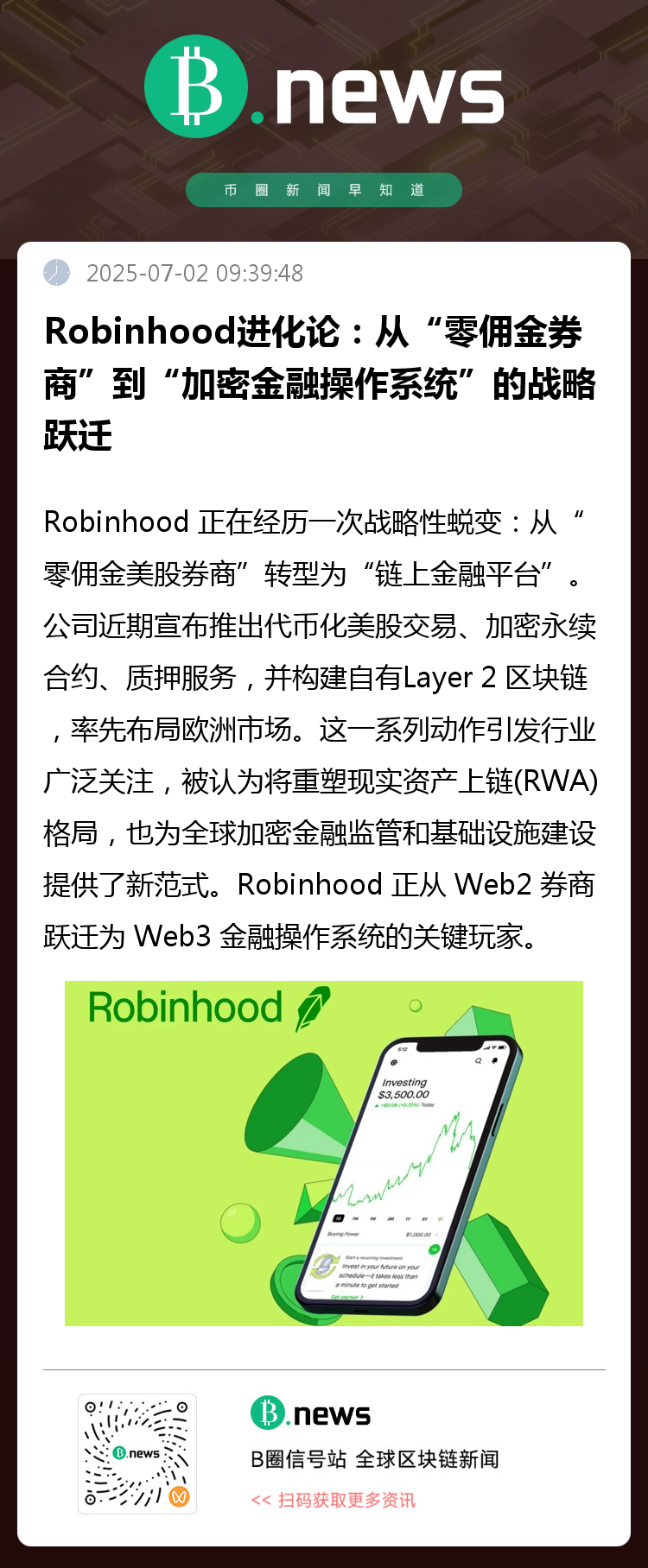 这种转型不仅让 Robinhood 赢得了资本市场的肯定(发布当天股价飙升12%,创历史新高),更意味着它将从传统券商平台的“末端交易入口”,升级为掌握发行、结算、清算全链条的“数字金融基建提供商”。