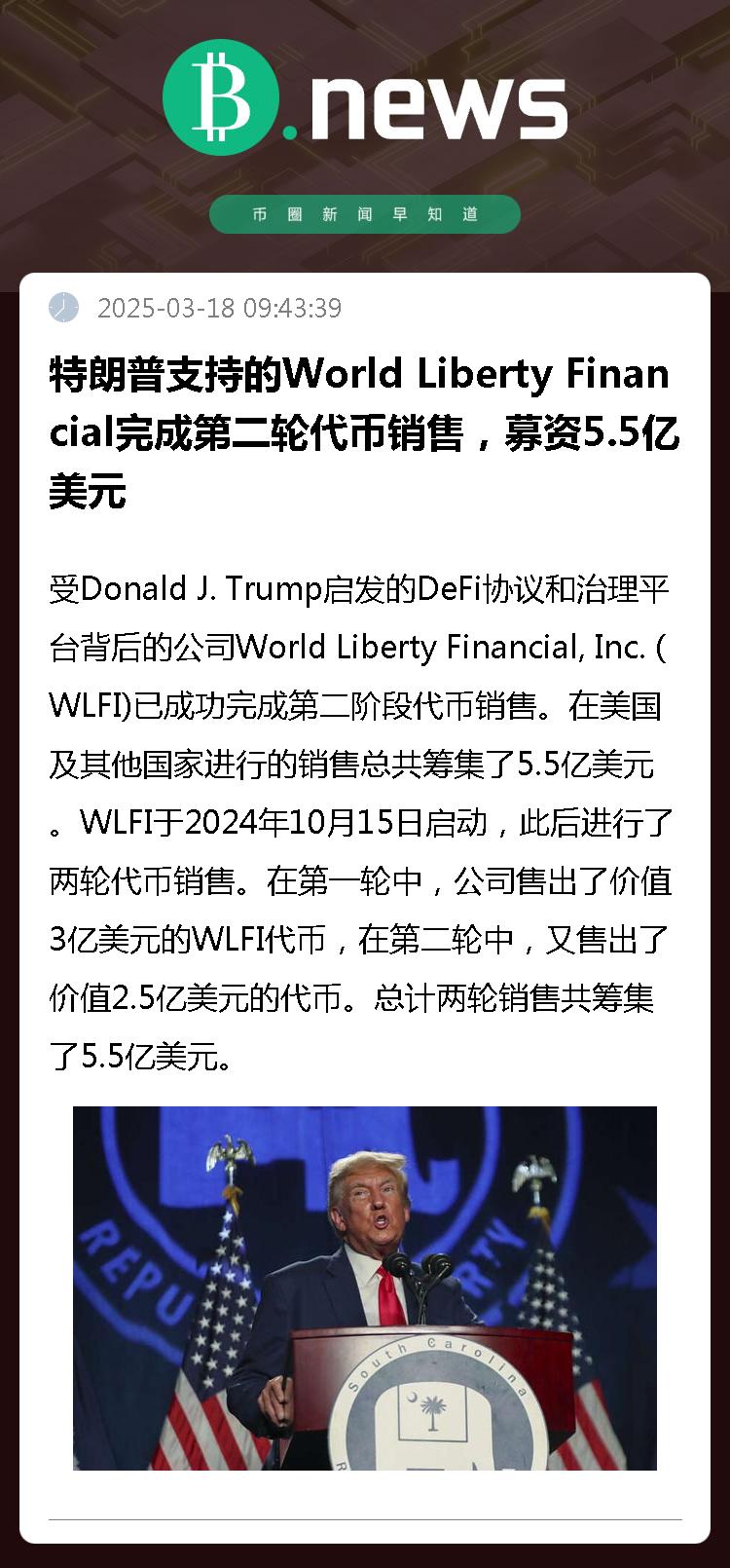 受Donald J. Trump启发的DeFi协议和治理平台背后的公司World Liberty Financial, Inc. (WLFI)已成功完成第二阶段代币销售。在美国及其他国家进行的销售总共筹集了5.5亿美元。