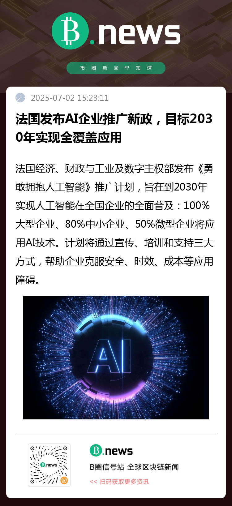法国经济、财政和工业与数字主权部今日正式发布《勇敢拥抱人工智能(AI):让AI在所有企业全面推广计划》,宣告法国将全面加速AI技术在本国企业中的应用,力争在2030年前实现全产业AI覆盖。