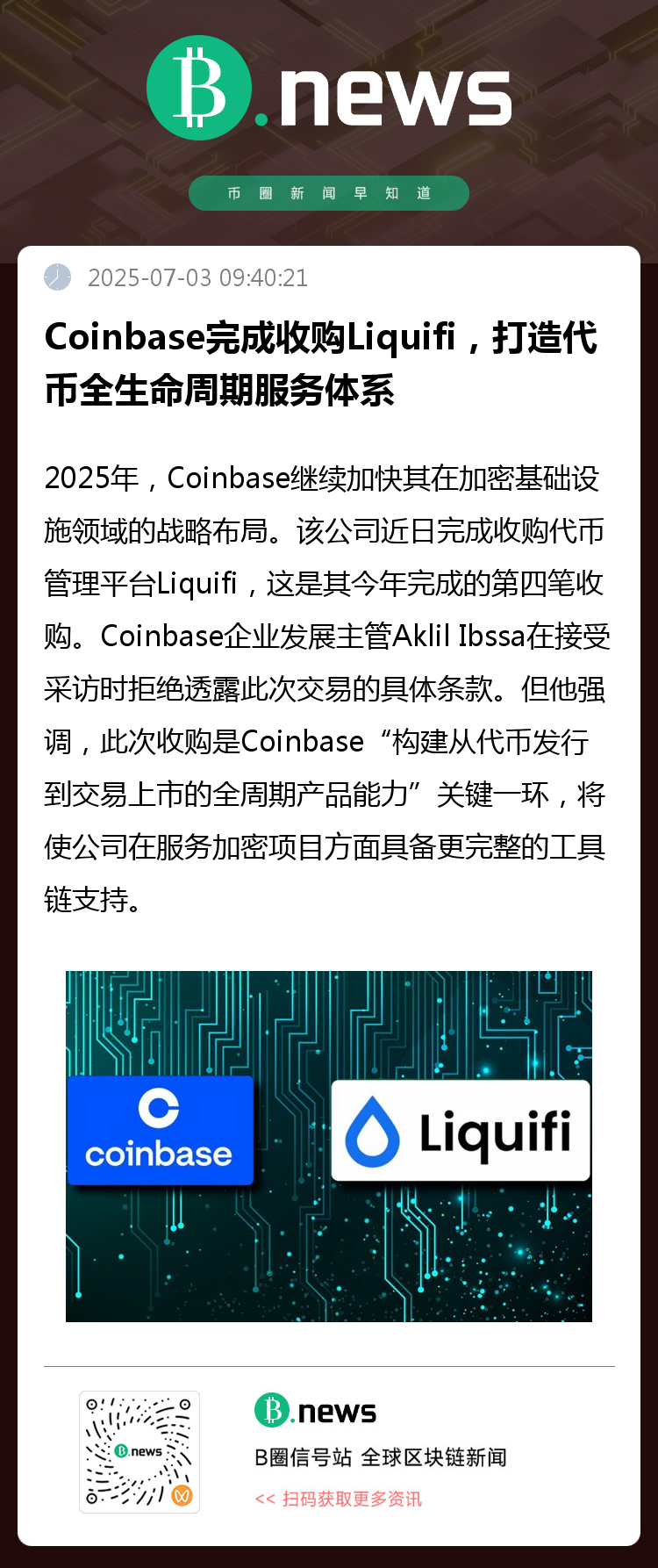 2025年,Coinbase继续加快其在加密基础设施领域的战略布局。该公司近日完成收购代币管理平台Liquifi,这是其今年完成的第四笔收购。Coinbase企业发展主管Aklil Ibssa在接受采访时拒绝透露此次交易的具体条款。但他强调,此次收购是Coinbase“构建从代币发行到交易上市的全周期产品能力”关键一环,将使公司在服务加密项目方面具备更完整的工具链支持。
