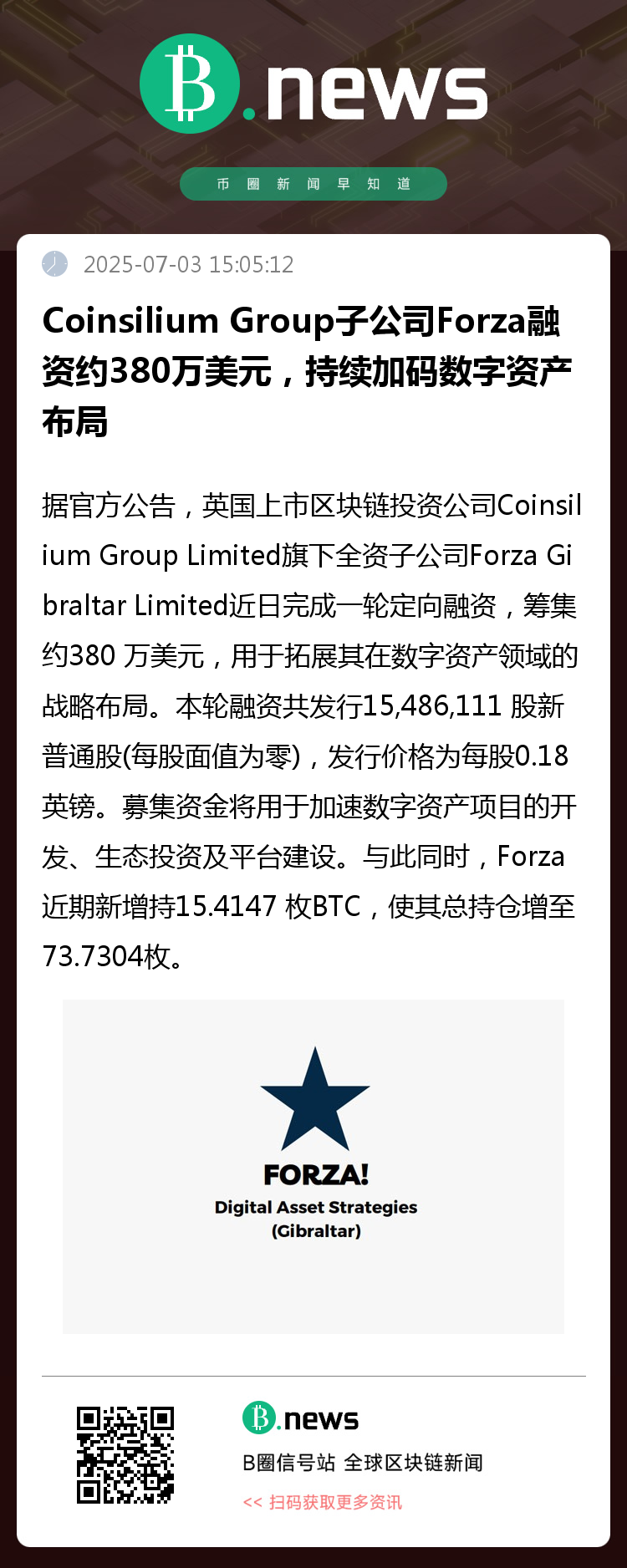 据官方公告,英国上市区块链投资公司Coinsilium Group Limited旗下全资子公司Forza Gibraltar Limited近日完成一轮定向融资,筹集约380 万美元(约合 300 万英镑),用于拓展其在数字资产领域的战略布局。