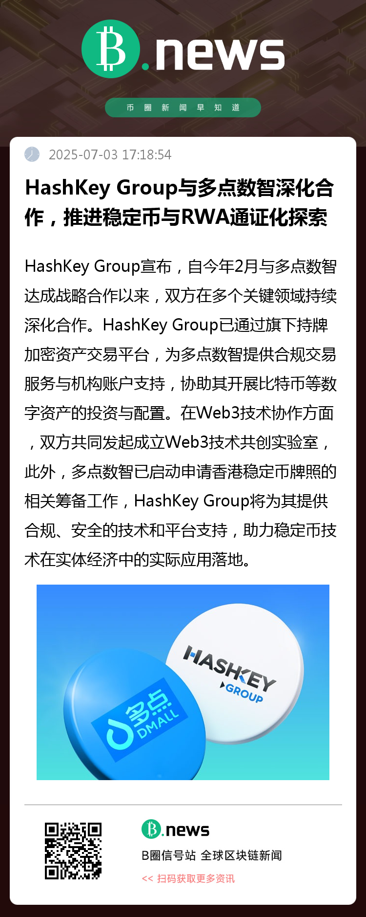根据合作协议,HashKey Group 已通过旗下持牌加密资产交易平台,为多点数智提供合规交易服务与机构账户支持,协助其开展比特币等数字资产的投资与配置,推进企业资产数字化转型。