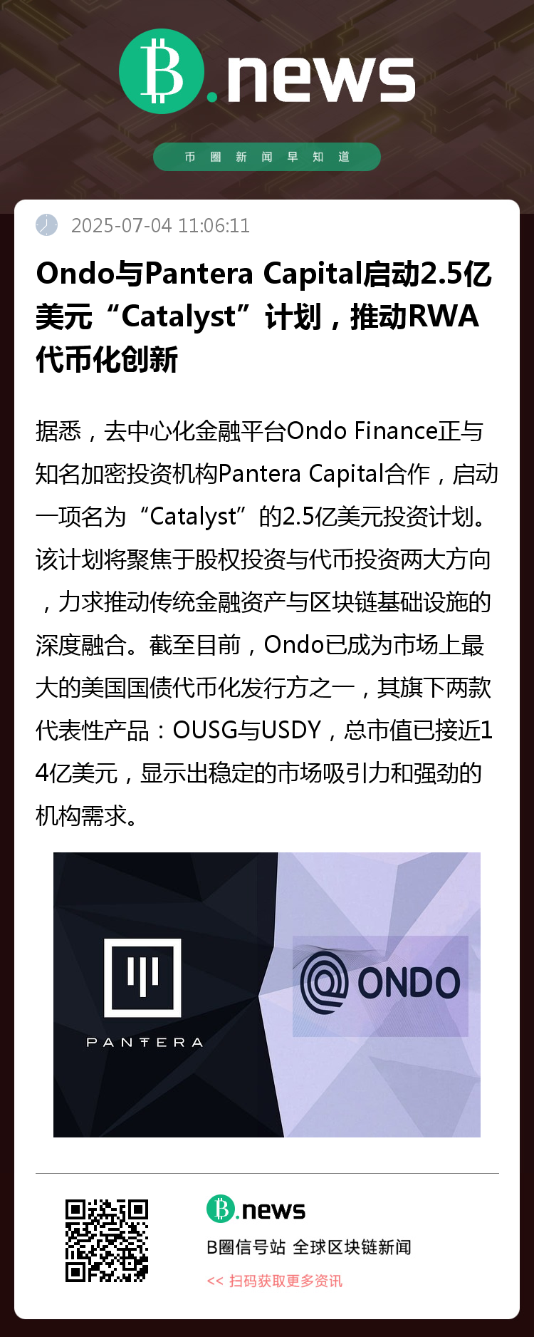 据悉,去中心化金融平台 Ondo Finance 正与知名加密投资机构 Pantera Capital 合作,启动一项名为“Catalyst”的 2.5 亿美元投资计划,旨在大规模投资与现实世界资产(RWA)代币化相关的项目。该计划将聚焦于股权投资与代币投资两大方向,力求推动传统金融资产与区块链基础设施的深度融合。