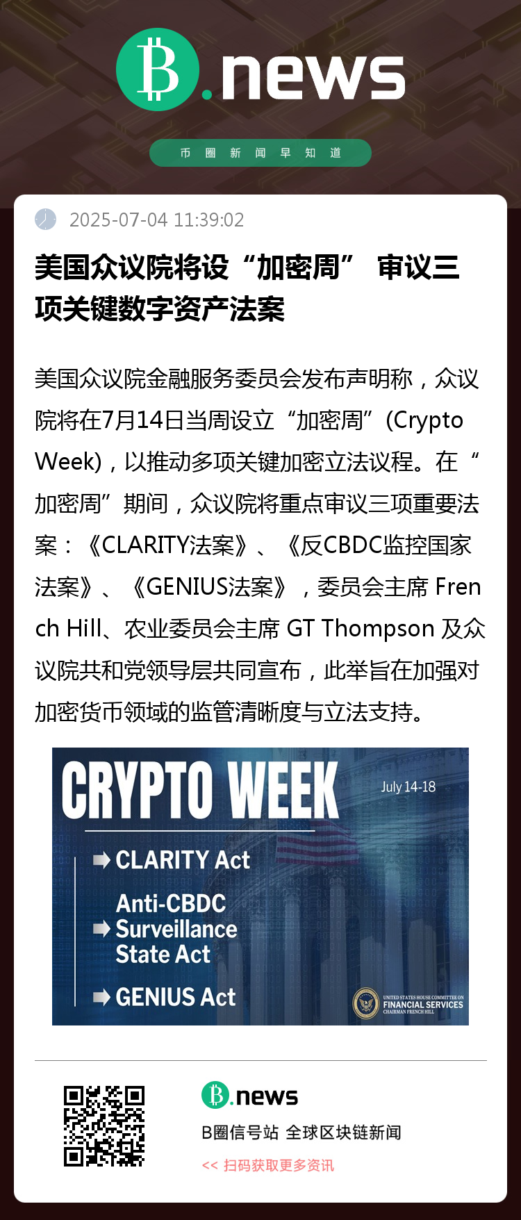 美国众议院金融服务委员会(Financial Services GOP)发布声明称,众议院将在7月14日当周设立“加密周”(Crypto Week),以推动多项关键加密立法议程。委员会主席 French Hill、农业委员会主席 GT Thompson 及众议院共和党领导层共同宣布,此举旨在加强对加密货币领域的监管清晰度与立法支持。