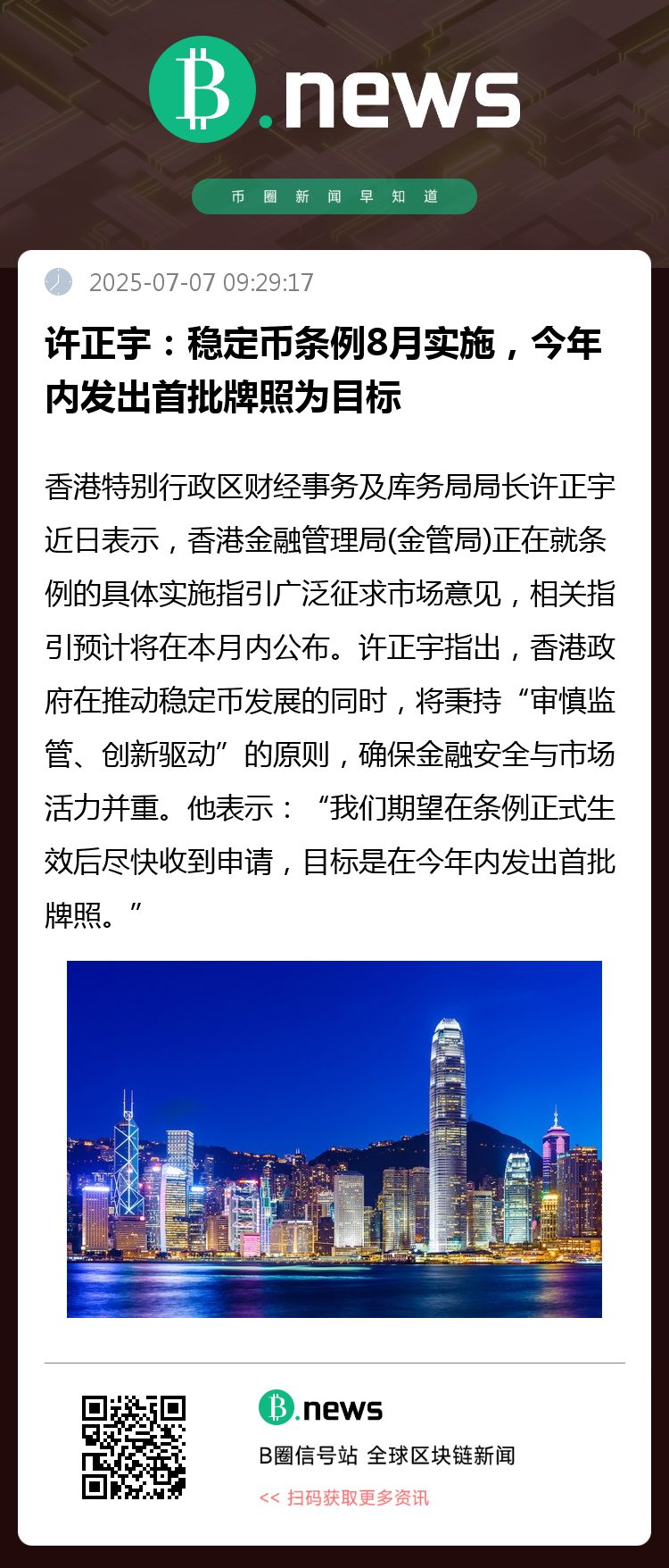 随着《稳定币条例》即将在8月正式生效,香港金融监管机构加快相关配套制度落地。香港特别行政区财经事务及库务局局长许正宇近日表示,香港金融管理局(金管局)正在就条例的具体实施指引广泛征求市场意见,相关指引预计将在本月内公布,涵盖反洗钱要求、资产托管、信息披露及其他合规监管框架。