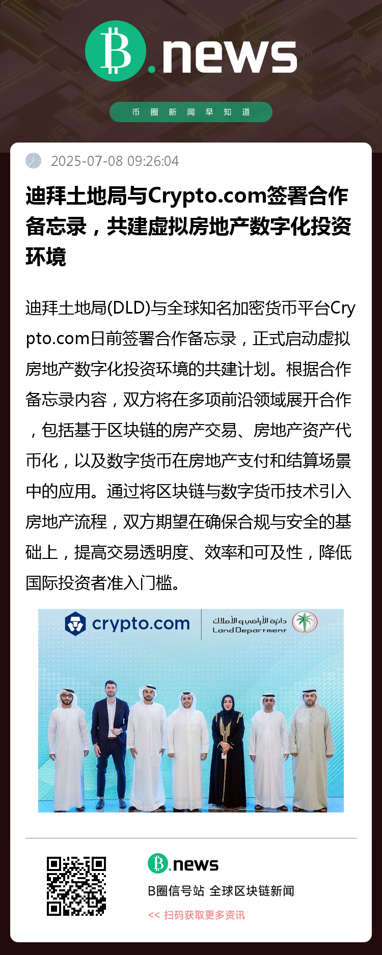 Crypto.com 则表示,将充分发挥其在数字资产、支付基础设施和合规框架等方面的全球经验,助力迪拜成为全球领先的虚拟资产和房地产创新中心。双方计划在未来数月内推进多个试点项目,并逐步扩大应用场景,形成可复制、可推广的国际合作模式。