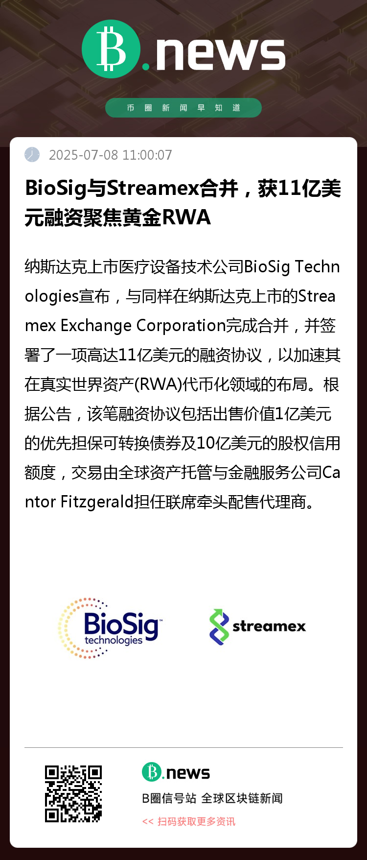 纳斯达克上市医疗设备技术公司BioSig Technologies宣布,与同样在纳斯达克上市的Streamex Exchange Corporation完成合并,并签署了一项高达 11 亿美元的融资协议,以加速其在真实世界资产(RWA)代币化领域的布局。