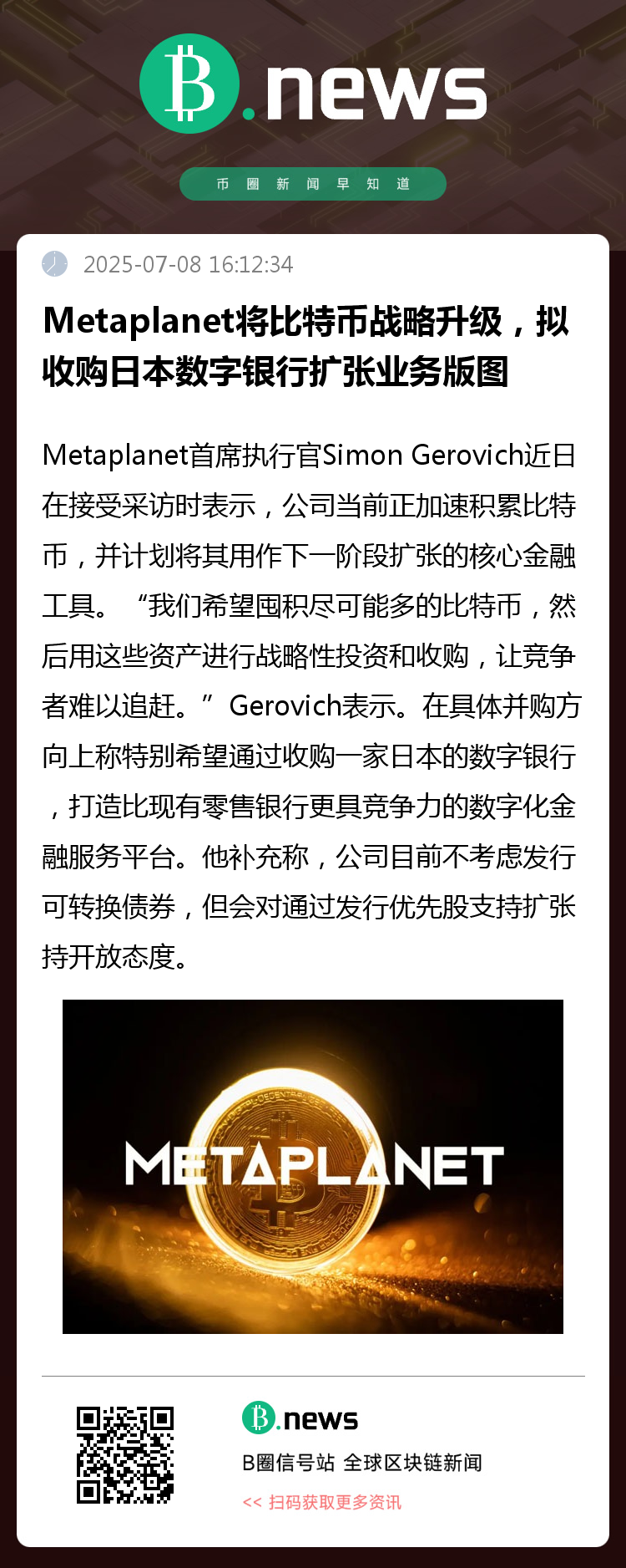 他补充称,公司目前不考虑发行可转换债券,但会对通过发行优先股支持扩张持开放态度。Metaplanet 此前已因采用“比特币为核心资产”的经营策略引发市场关注,此次公开表态显示其正谋求以数字资产为支点,深度布局传统金融领域。