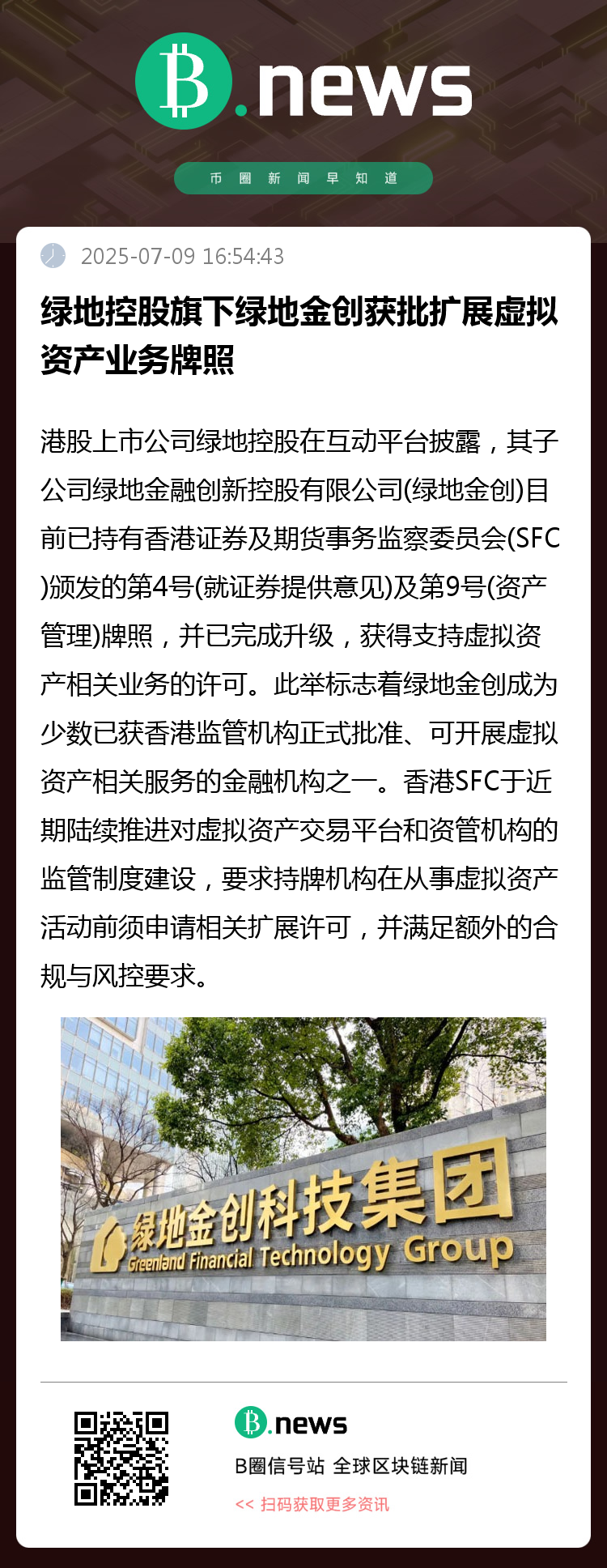 港股上市公司绿地控股在互动平台披露,其子公司绿地金融创新控股有限公司(绿地金创)目前已持有香港证券及期货事务监察委员会(SFC)颁发的第4号(就证券提供意见)及第9号(资产管理)牌照,并已完成升级,获得支持虚拟资产相关业务的许可。