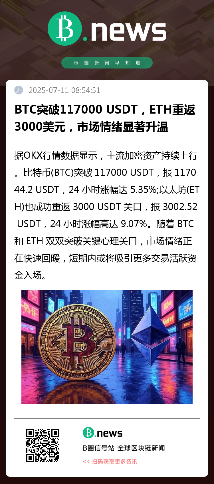据 OKX 行情数据显示,主流加密资产持续上行。比特币(BTC)突破 117000 USDT,报 117044.2 USDT,24 小时涨幅达 5.35%;以太坊(ETH)也成功重返 3000 USDT 关口,报 3002.52 USDT,24 小时涨幅高达 9.07%。