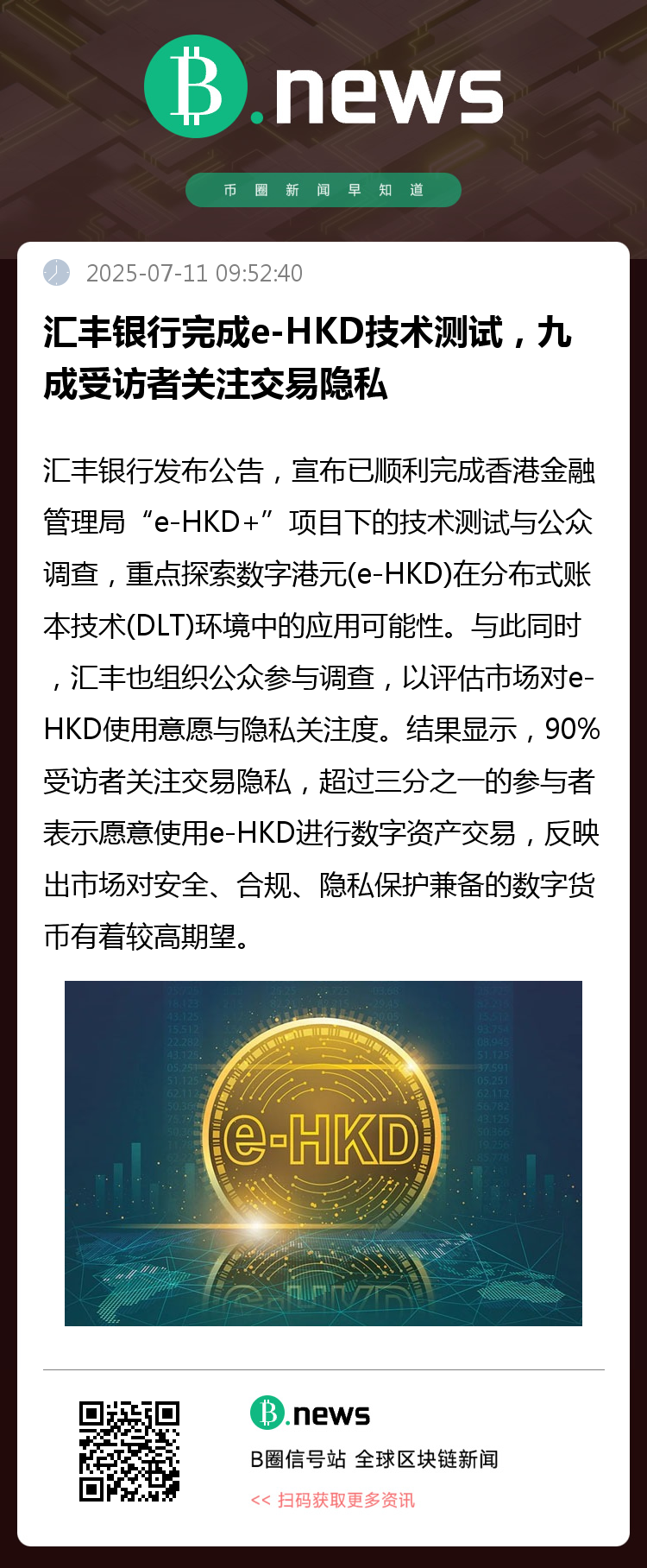 汇丰方面表示,将继续基于“e-HKD+”项目成果,加快推动 e-HKD 在跨境支付、数字资产交易、零售场景等真实业务中的落地探索,为未来金融基础设施的数位升级提供支撑。