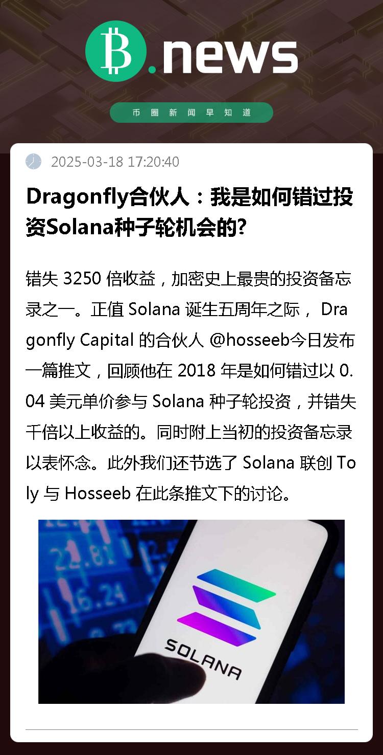 正值 Solana 诞生五周年之际, Dragonfly Capital 的合伙人 @hosseeb今日发布一篇推文,回顾他在 2018 年是如何错过以 0.04 美元单价参与 Solana 种子轮投资,并错失千倍以上收益的。同时附上当初的投资备忘录以表怀念。此外我们还节选了 Solana 联创 Toly 与 Hosseeb 在此条推文下的讨论。