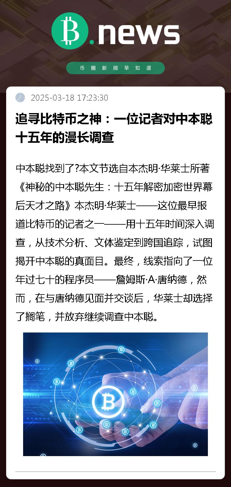 中本聪找到了?本文节选自本杰明·华莱士所著《神秘的中本聪先生:十五年解密加密世界幕后天才之路》本杰明·华莱士——这位最早报道比特币的记者之一——用十五年时间深入调查,从技术分析、文体鉴定到跨国追踪,试图揭开中本聪的真面目。最终,线索指向了一位年过七十的程序员——詹姆斯·A·唐纳德,然而,在与唐纳德见面并交谈后,华莱士却选择了搁笔,并放弃继续调查中本聪。