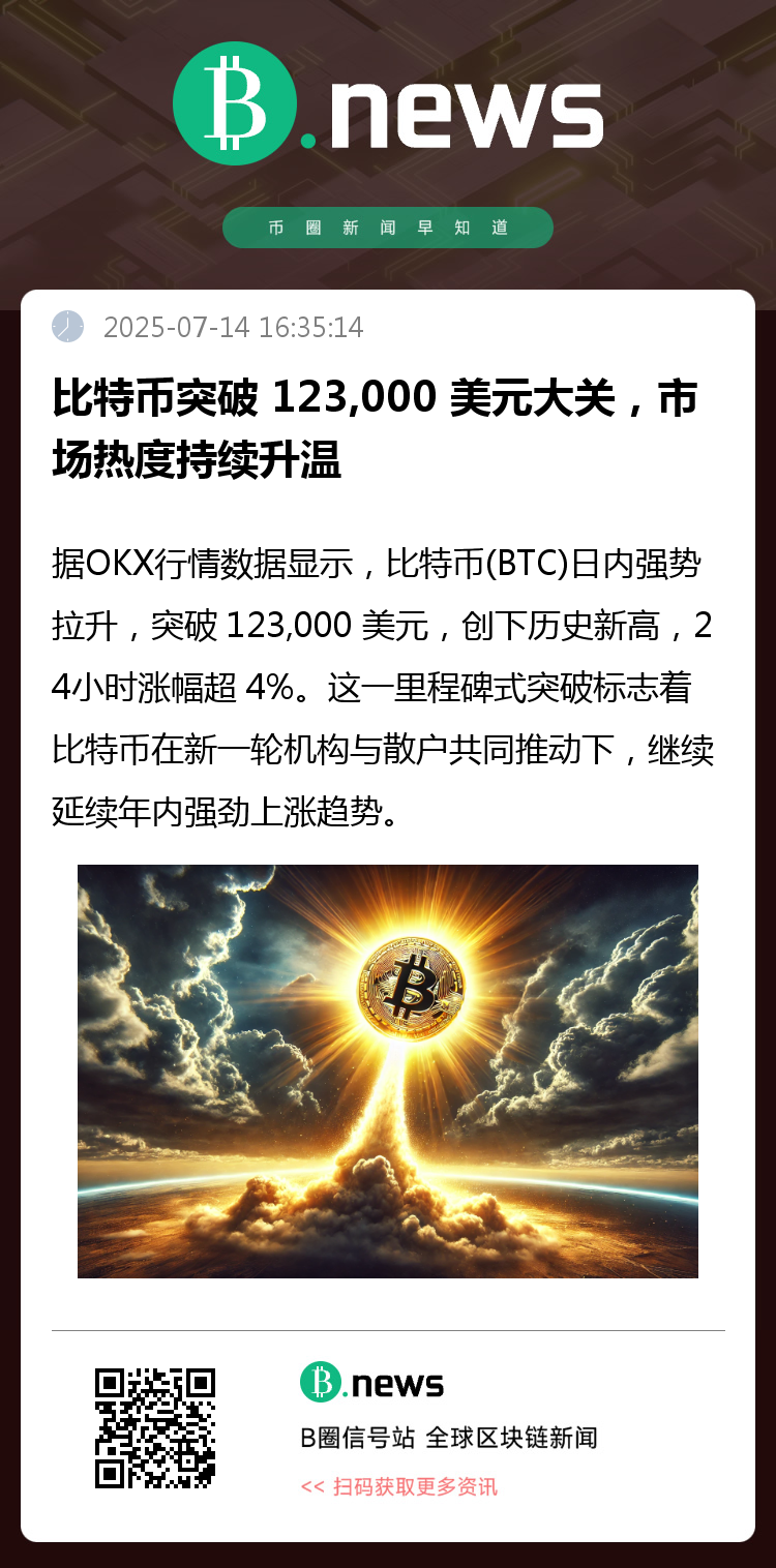 据 OKX 行情数据显示,比特币(BTC)日内强势拉升,突破 123,000 美元,创下历史新高,24小时涨幅 3.71%。这一里程碑式突破标志着比特币在新一轮机构与散户共同推动下,继续延续年内强劲上涨趋势。