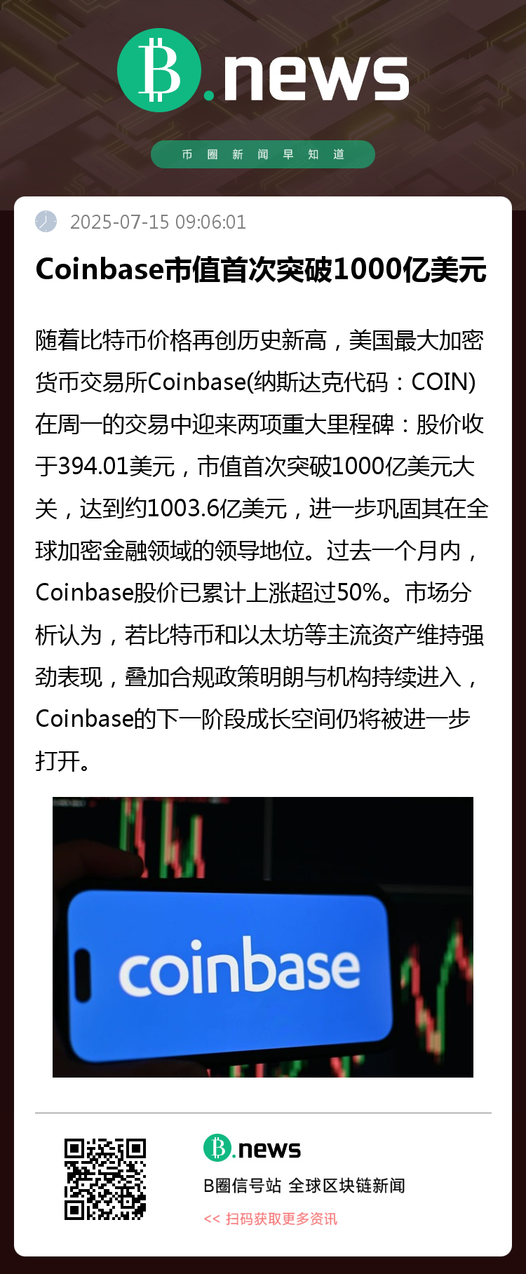 随着比特币价格再创历史新高,美国最大加密货币交易所Coinbase(纳斯达克代码:COIN)在周一的交易中迎来两项重大里程碑:股价收于394.01美元,市值首次突破1000亿美元大关,达到1003.56亿美元,进一步巩固其在全球加密金融领域的领导地位。